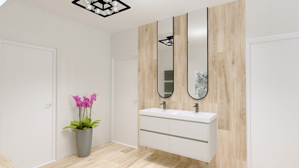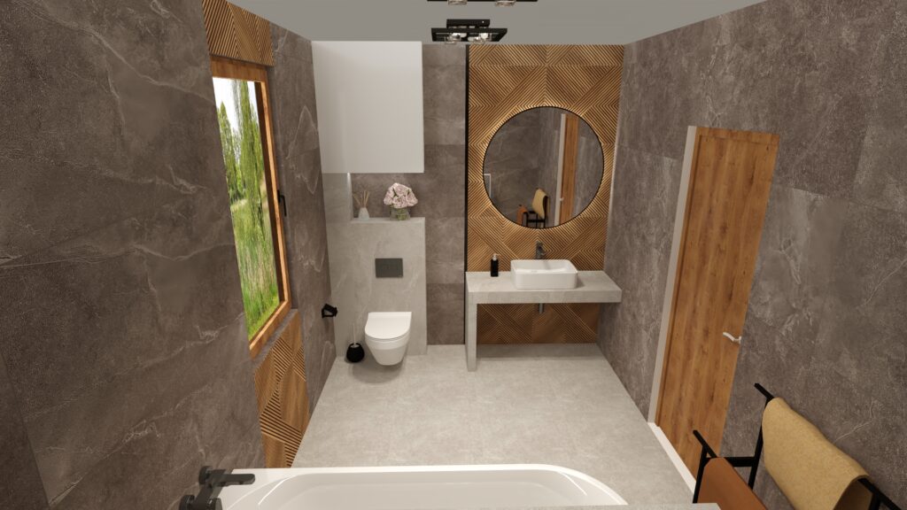 W dużej łazience kluczowe jest zachowanie równowagi między przestronnością, funkcjonalnością i nowoczesnym designem. W tej aranżacji główną rolę odgrywają płytki
