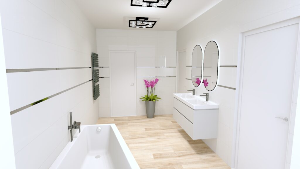Nowoczesna, duża łazienka może być zarówno luksusowa, jak i przytulna. W tej aranżacji wykorzystano płytki Shiny Lines z listwami błyszczącymi