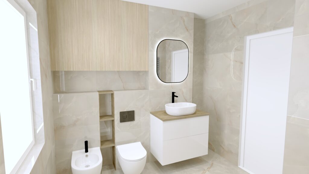 Ta łazienka łączy w sobie klasyczną elegancję z przytulnym, naturalnym charakterem. Płytki Torano White tworzą jasną, marmurową bazę, optycznie powiększając