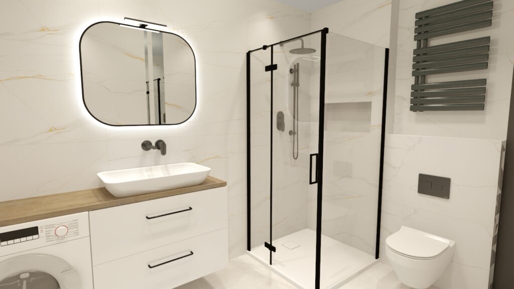 Planujesz urządzić niewielką łazienkę w bloku? Poniżej znajdziesz propozycję aranżacji z użyciem płytek SIDORNO GOLD POLER 60×120 na ścianach oraz