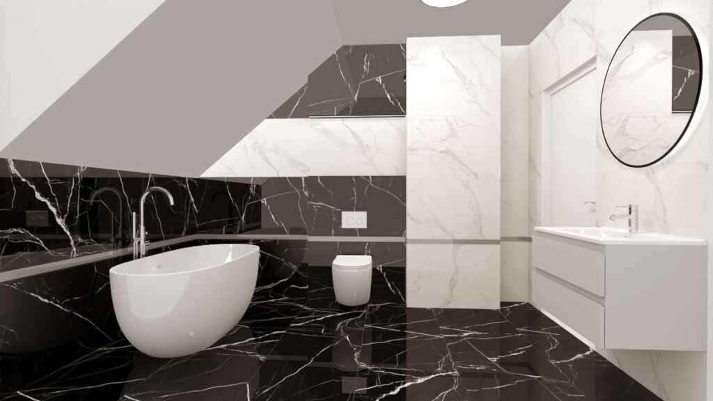 Planujesz łazienkę, która łączy elegancję z nowoczesnym stylem? Oto propozycja aranżacji, która łączy dwie kolekcje płytek dostępnych w 1000plytek.pl —
