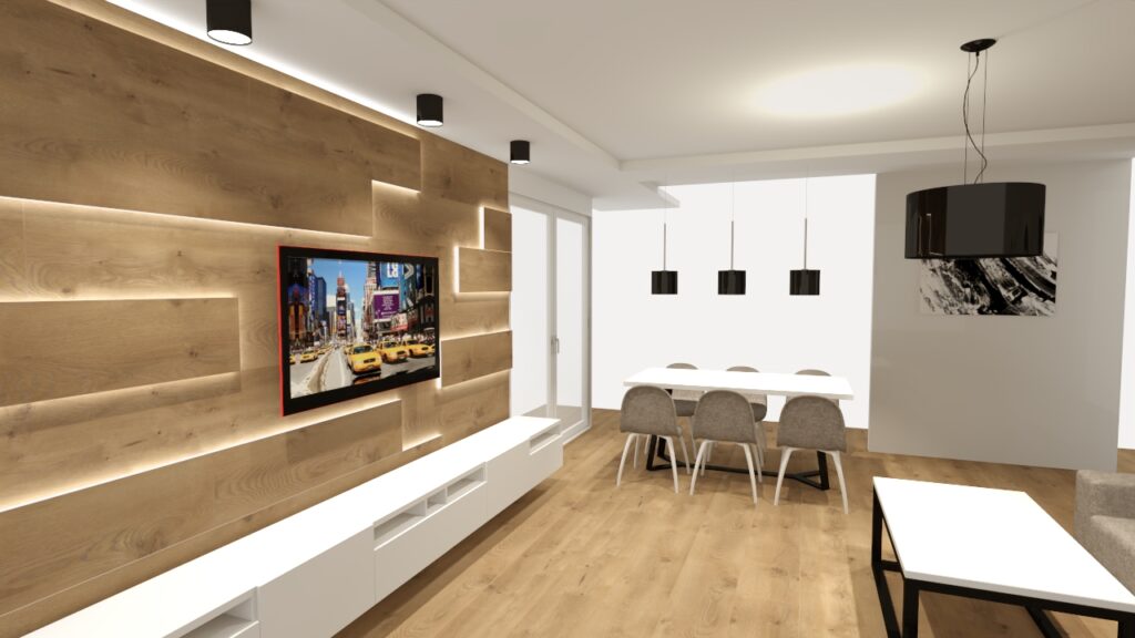 Ściana telewizyjna w salonie z gresu 30×120 drewnopodobnego — nowoczesny pomysł na wyjątkowe wnętrze