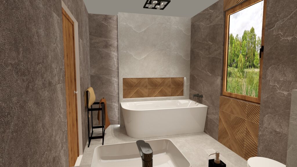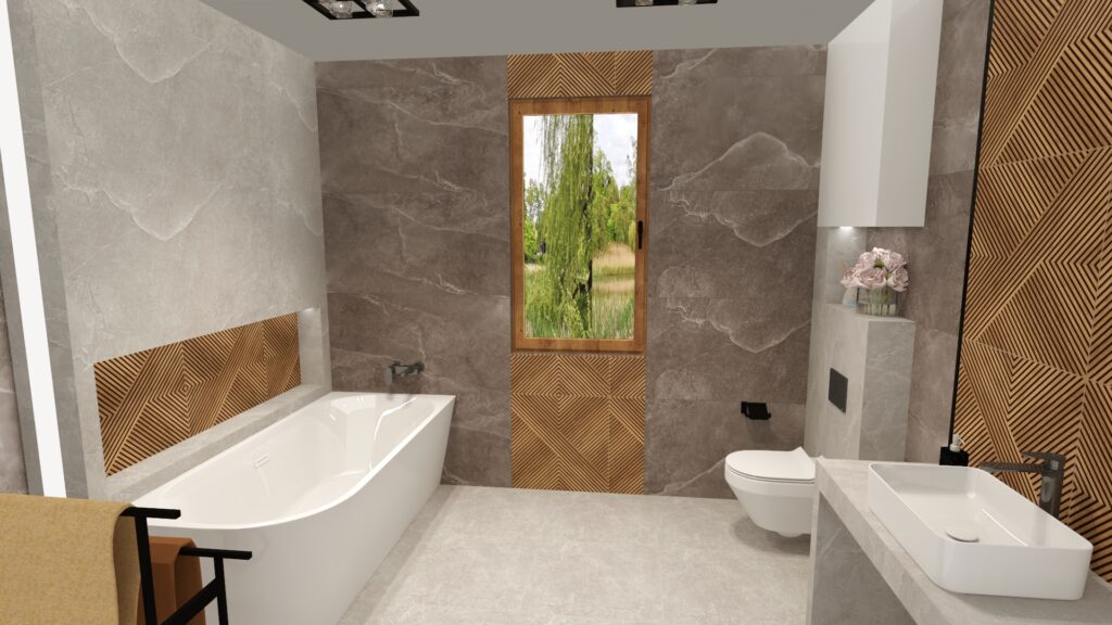 W dużej łazience kluczowe jest zachowanie równowagi między przestronnością, funkcjonalnością i nowoczesnym designem. W tej aranżacji główną rolę odgrywają płytki Grand Cave Grey na ścianach i Grand Cave Graphite jako akcent kontrastujący, uzupełnione dekoracyjnym gresem Stargres Costole 60×60, który wprowadza ciekawy rytm i strukturę. To połączenie nadaje wnętrzu nowoczesnego charakteru, elegancji i ponadczasowego stylu.