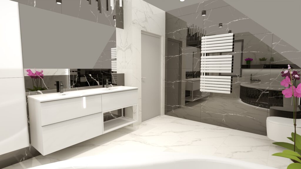 • Podłoga lub wybrana ściana w Fury Black, reszta w Carrara Blanco.