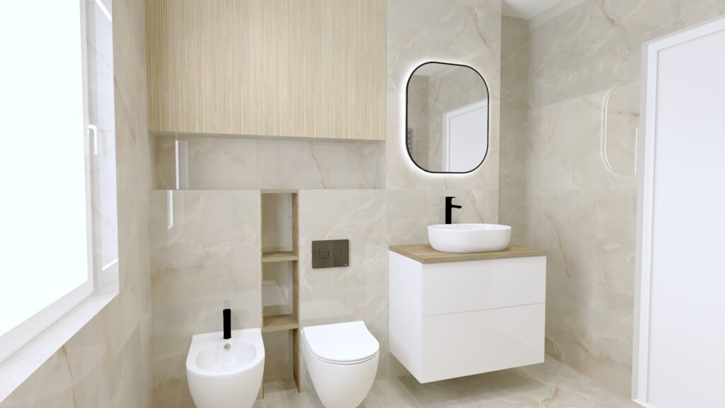 Małe łazienki wcale nie muszą być nudne ani ograniczające. Odpowiedni dobór materiałów potrafi całkowicie odmienić przestrzeń, nadając jej luksusowy charakter i wizualnie ją powiększając. W tej aranżacji główną rolę odgrywa duet płytek polerowanych: elegancki Onyx Gold Poler Odense White 60×120 oraz naturalnie ocieplający przestrzeń dekor Baldocer Larchwood Alder 40×120. Całość uzupełniają funkcjonalne meble Cersanit, które idealnie wpisują się w potrzeby niewielkich wnętrz.
