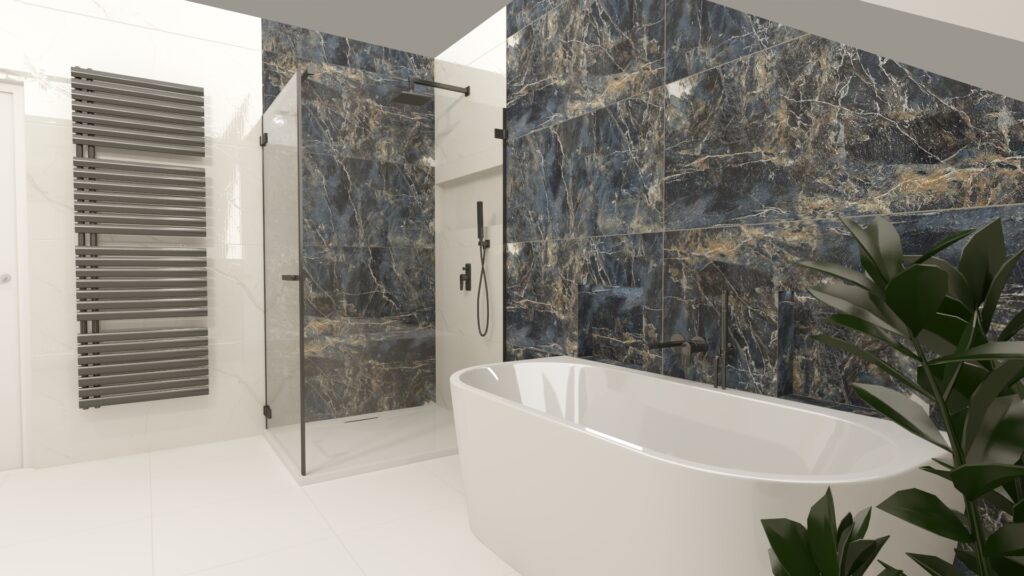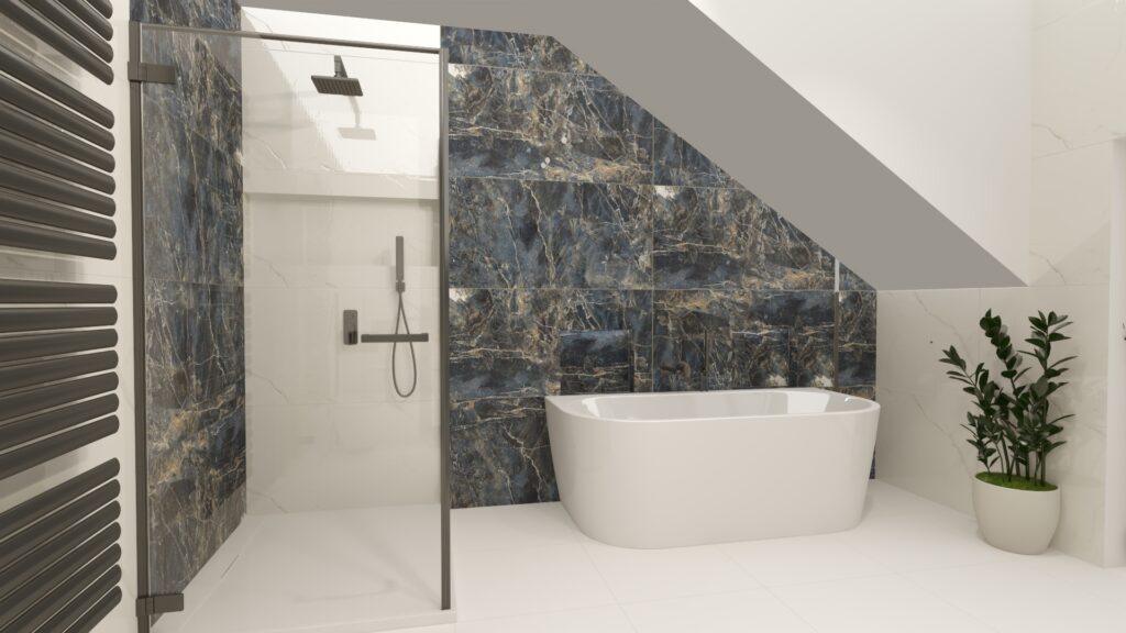 • Strefa prysznicowa / ściana akcentowa — Rocka Blue, reszta neutralna