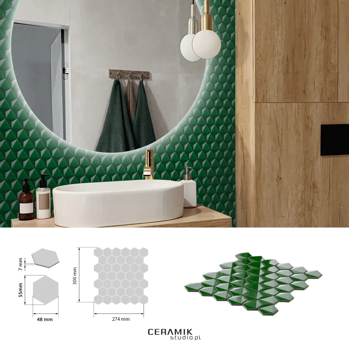 Płytki można montować z innymi płytkami dostępnymi na rynku. Mozaika 3D Hex Green – trójwymiarowy heksagon w zieleni Opis ogólny Mozaika 3D Hex Green to wyjątkowy element dekoracyjny, który łączy geometryczny kształt heksagonu z trójwymiarową strukturą i soczystym, zielonym kolorem. Jest idealna do wnętrz, w których chcesz wprowadzić nowoczesny akcent oraz głębię wizualną. Design i kolorystyka Charakterystyczny sześciokątny (heksagonowy) kształt w połączeniu ze strukturą 3D nadaje płytkom efekt przestrzenności – wyglądają jak wypukłe plastry heksagonu. Zielony odcień mozaiki dodaje wnętrzu świeżości, elegancji i naturalnego charakteru — idealny do połączenia z bielą, drewnem, a także ciemniejszymi tonami. Materiał i jakość wykonania Wykonana z ceramiki — co zapewnia trwałość i odporność. Gatunek I — wysoka jakość płytek. Grubość mozaiki: ok. 8 mm (zgodnie z typowymi parametrami 3D mozaik) Allegro Wykończenie powierzchni: połysk — co podkreśla efekt 3D i odbija światło. Produkcja w wysokiej temperaturze (powyżej 1000 °C) zapewnia odporność mechaniczna, chemiczna i termiczna. Allegro Klasa reakcji na ogień: A1, co oznacza, że płytki są niepalne i bezpieczne do stosowania w pobliżu źródeł ciepła. Allegro Zastosowanie Mozaika 3D Hex Green sprawdzi się doskonale w różnych przestrzeniach: w łazienkach czy kabinach prysznicowych — dzięki odporności na wilgoć, w kuchniach — jako dekoracyjny akcent na ścianie, w strefach SPA, recepcjach, salonach — tam, gdzie efekt wizualny i elegancja są ważne, w przestrzeniach komercyjnych — nadaje nowoczesny, designerski charakter. Zielona barwa mozaiki dobrze komponuje się z bielą, czernią, jasnym drewnem oraz naturalnymi materiałami. Montaż i pielęgnacja Mozaika montowana jest na elastycznej siatce, co znacznie ułatwia i przyspiesza układanie. Allegro Zalecany jest klej do płytek ceramicznych oraz fuga min. 2 mm, by zapewnić stabilność i estetyczne wykończenie. Do czyszczenia zaleca się użycie łagodnych detergentów i miękkiej ściereczki — należy unikać szorstkich gąbek, by nie uszkodzić powierzchni. Zalety i korzyści Trójwymiarowy efekt 3D dodaje głębi i wyjątkowego charakteru ścianie. Zielony kolor wprowadza naturalność i odświeżenie — świetny kontrast lub akcent kolorystyczny. Wysoka jakość ceramiki i wypalanie w wysokiej temperaturze gwarantują trwałość. Bezpieczna klasa A1 — możliwość zastosowania w pobliżu źródeł ciepła. Łatwy montaż dzięki siatce — idealne rozwiązanie dla inwestorów i majsterkowiczów. Podsumowanie Mozaika 3D Hex Green to stylowy, trójwymiarowy element dekoracyjny, który łączy unikający design z trwałością ceramiki. Zielony kolor i heksagonalny kształt sprawiają, że mozaika świetnie sprawdzi się zarówno w nowoczesnych, minimalistycznych wnętrzach, jak i w bardziej odważnych aranżacjach. To świetny wybór dla osób, które chcą nadać ścianom wyjątkowy charakter i głębię.