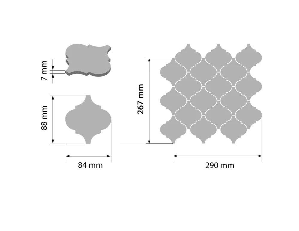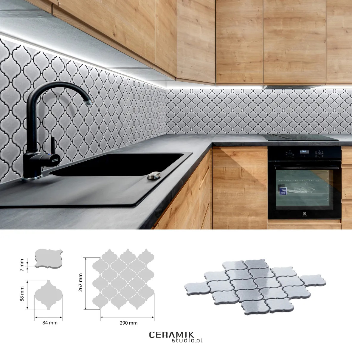 gatunek: gatunek I Mozaika Arabesque Metalic Black Charakterystyka produktu Mozaika Arabesque Metalic Black to ceramiczna mozaika w kształcie arabeski w głębokim, metalicznym odcieniu czerni. Posiada połyskujące wykończenie, które dodaje elegancji i subtelnej głębi kolorystycznej. Każda
