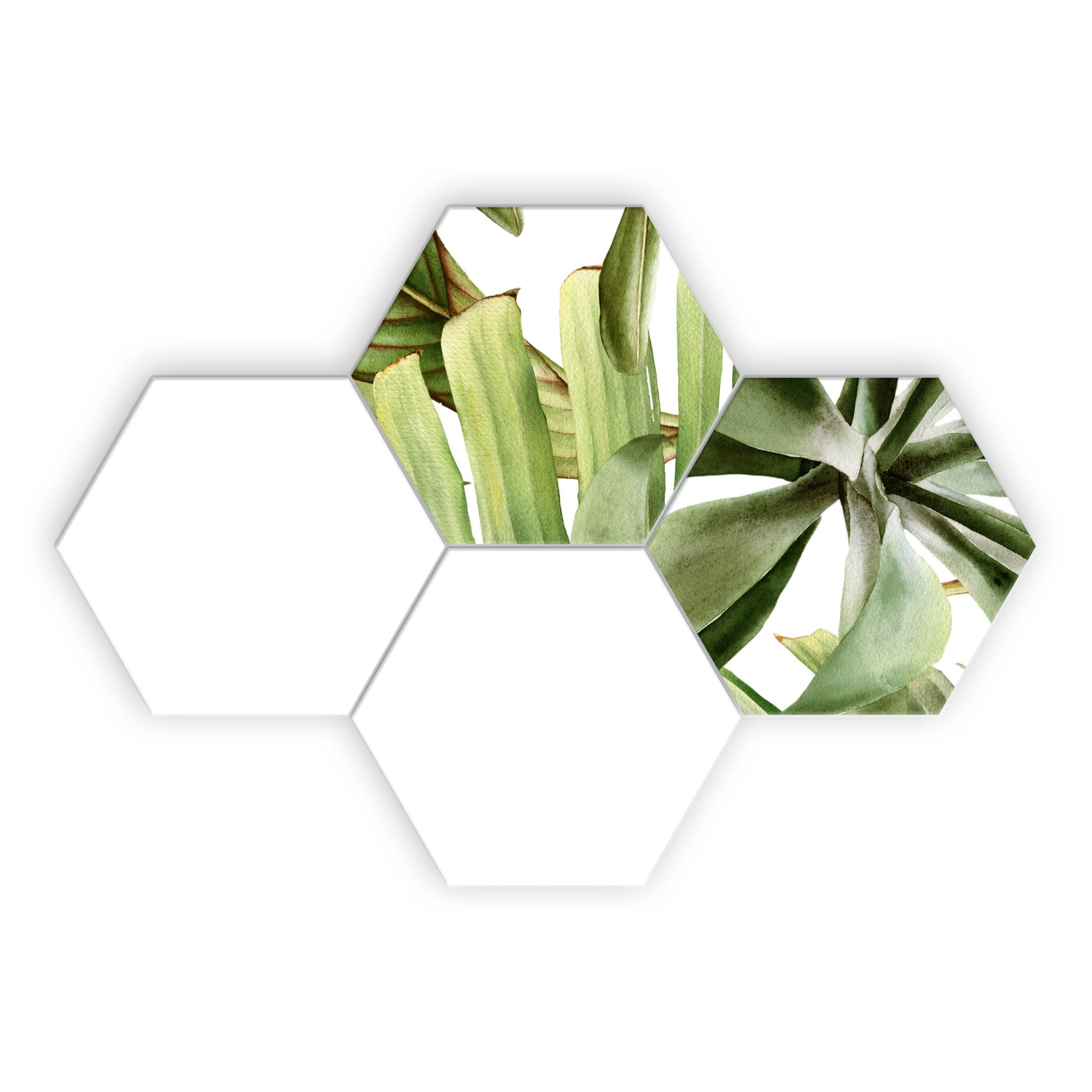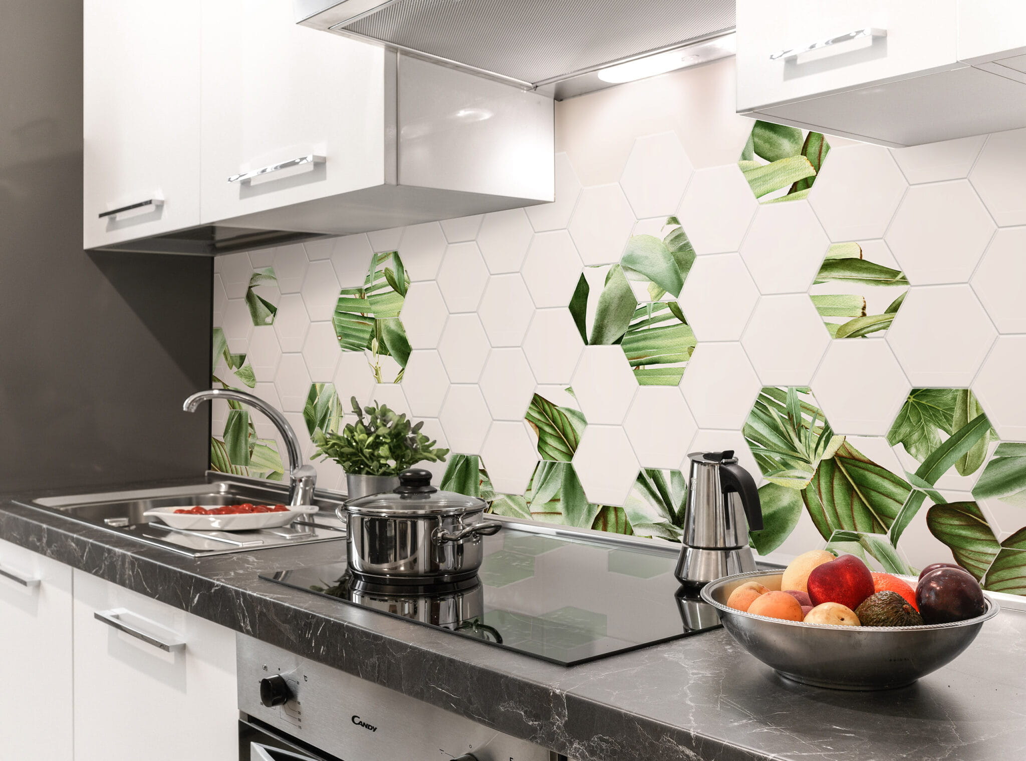 Grubość: 8mm Wymiar plastra 36x25cm Płytka ścienna ceramiczna Kolor biały,zielony Gatunek I Kształt: heksagon Produkt Polski z wykorzystaniem włoskich i hiszpańskich materiałów. Mozaika Heksagon White Tropik – opis produktu Charakterystyka ogólna Mozaika Heksagon White Tropik to ceramiczna mozaika ścienna w kształcie sześciokątnych (heksagon) płytek z dekoracyjnym motywem tropikalnych liści na białym tle. Motyw liści wprowadza do wnętrza świeżość, naturalny klimat oraz subtelny egzot
