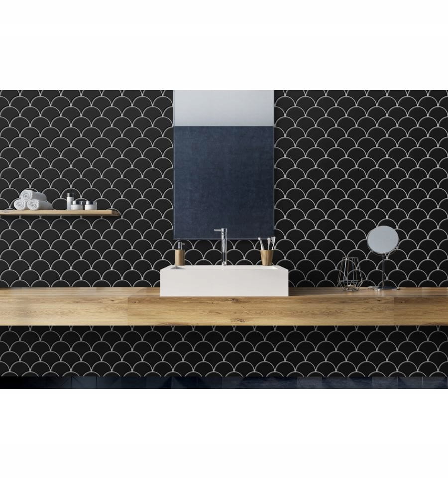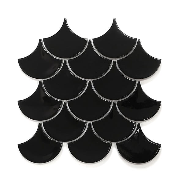 Wymiary plastra: 31,5x30cm grubość: 8 mm Kolor czarny Powierzchnia: Błysk   Mozaika Łuska Czarna – efektowny kształt „rybiej łuski” w czerni Wyjątkowy design i kształt Mozaika Łuska Czarna to płytki ceramiczne w kształcie stylizowanej rybiej łuski, które w czarnym kolorze i połyskliwym wykończeniu wprowadzają do wnętrza elegancki i dekoracyjny charakter. Kształt łuski umożliwia tworzenie ciekawych, luksusowych kompozycji ściennych, będąc alternatywą dla klasycznych kwadratowych płytek. P