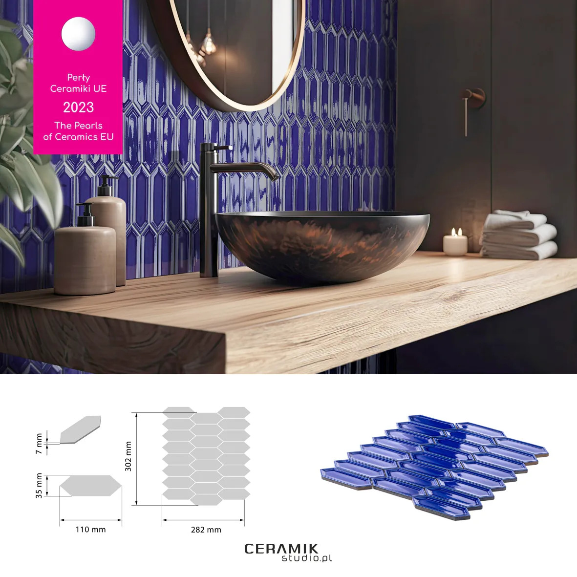 gatunek: gatunek I Mozaika Sorrento Cobalt Charakterystyka produktu Mozaika Sorrento Cobalt to ceramiczna płytka w głębokim, kobaltowym odcieniu. Posiada połyskujące wykończenie, które nadaje wnętrzu elegancji i efektownego blasku. Każda kostka ma wymiary 35 × 110 mm, a plastry mozaiki 302