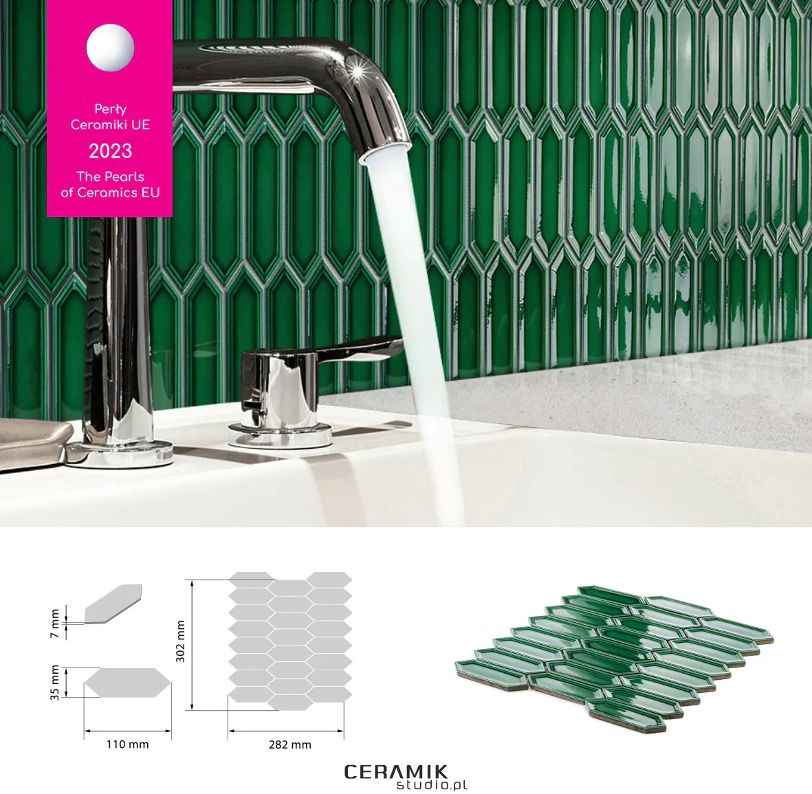 gatunek: gatunek I Mozaika Sorrento Emerald Charakterystyka produktu Mozaika Sorrento Emerald to ceramiczna płytka w intensywnym, szmaragdowym odcieniu zieleni. Posiada połyskujące wykończenie, które nadaje wnętrzu elegancji i głębi koloru. Każda kostka ma wymiary 35 × 110 mm, a plastry mozai