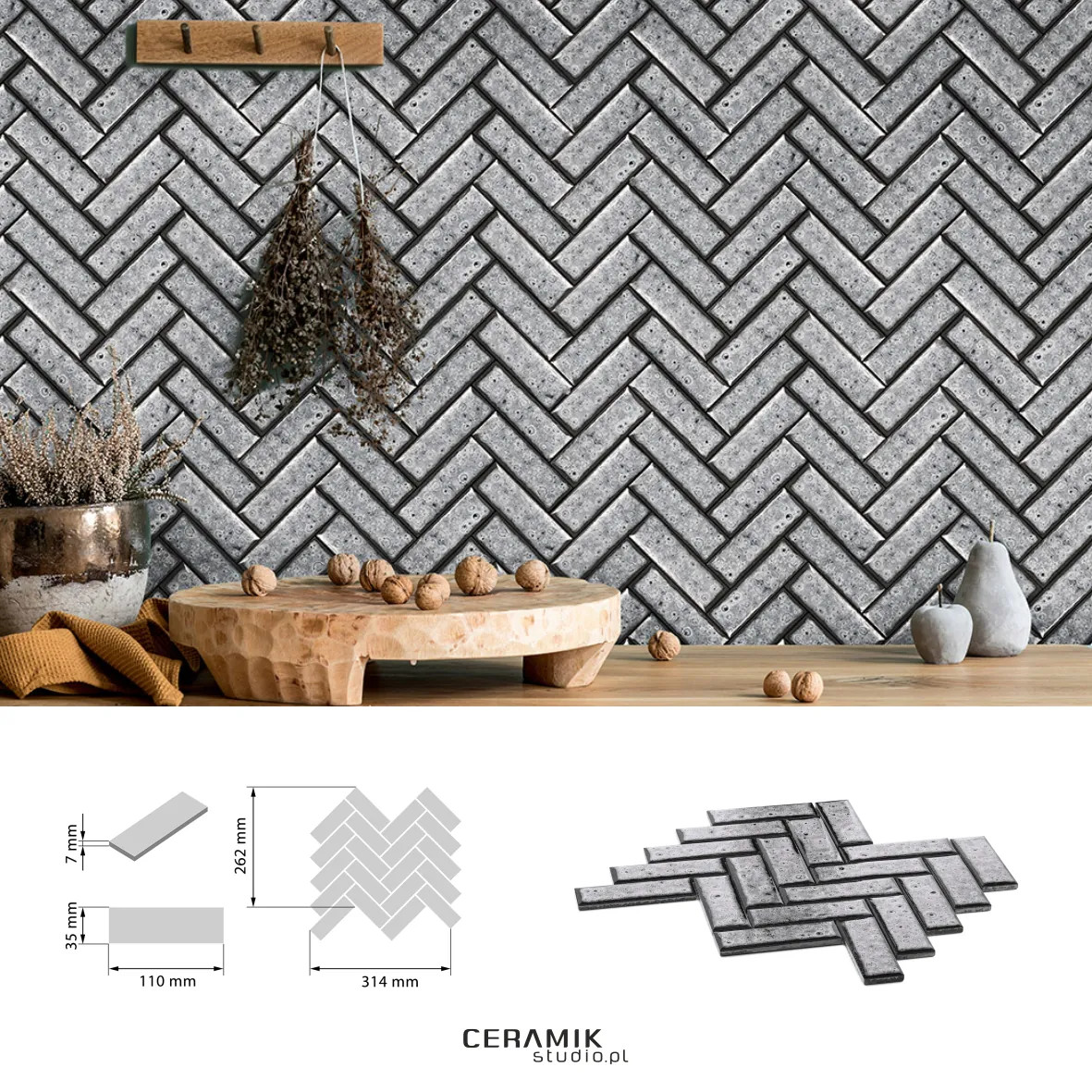 Płytki można montować z innymi płytkami dostępnymi na rynku. Mozaika Vibrant Quicksilver – opis produktu Charakterystyka ogólna Mozaika Vibrant Quicksilver to elegancka mozaika ceramiczna utrzymana w odcieniach szarości z połyskującym wykończeniem. Jej stylowy, nowoczesny charakter sprawia, że doskonale pasuje do wnętrz urządzonych w estetyce modern, glamour, industrial oraz soft loft. Kształt ułożenia przypomina układ jodełki, dzięki czemu powierzchnia zyskuje efekt dynamiki i luksusu. Specyfikacja techniczna Materiał: ceramika Zastosowanie: ściana (wnętrza) Wykończenie: połysk Rozmiar arkusza: ok. 26,2 × 31,4 cm Grubość: 7 mm Gatunek: I Klasa reakcji na ogień: A1 (materiał niepalny) Temperatura wypału: powyżej 1000°C Montaż: mozaika naklejona na siatkę ułatwiającą układanie Możliwość docinania: tak Zalety mozaiki odporność na wilgoć i podwyższone temperatury, wysoka trwałość i stabilność dzięki wypalaniu w wysokiej temperaturze, efekt głębi i odbicia światła dzięki połyskującej powierzchni, szybki i wygodny montaż dzięki arkuszom na siatce, możliwość tworzenia dekorów, paneli ściennych i pasów akcentowych. Kolorystyka i styl wnętrz Odcienie srebra i szarości doskonale komponują się z: armaturą w kolorze chrom, czarnym i szczotkowanym złocie, płytkami imitującymi marmur, beton lub trawertyn, drewnem naturalnym i meblami w stylu nowoczesnym oraz minimalistycznym. Mozaika szczególnie dobrze sprawdza się w: łazienkach (w tym w kabinie prysznicowej), toaletach i strefach gościnnych, kuchniach pomiędzy blatem a szafkami, przestrzeniach SPA i strefach wellness, wnętrzach komercyjnych o podwyższonych wymaganiach estetycznych. Montaż i pielęgnacja Montaż Do montażu rekomendowane są: klej do płytek ceramicznych, fuga elastyczna, silikon do wykończenia krawędzi. Czyszczenie Do pielęgnacji należy stosować: delikatne detergenty, miękkie ściereczki lub gąbki. Unikać należy agresywnych środków chemicznych oraz twardych powierzchni ściernych, aby nie zmatowić szkliwa. Podsumowanie Mozaika Vibrant Quicksilver to propozycja dla osób, które poszukują eleganckiego i efektownego wykończenia ścian. Połyskująca powierzchnia, atrakcyjny układ jodełki oraz ponadczasowa kolorystyka sprawiają, że produkt świetnie uzupełnia nowoczesne aranżacje wnętrz, dodając im głębi i prestiżowego charakteru.