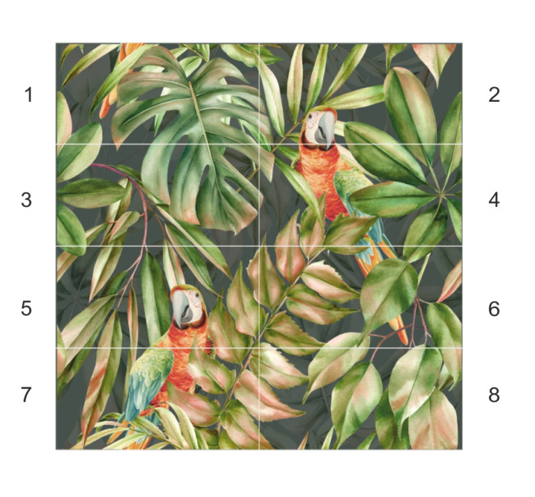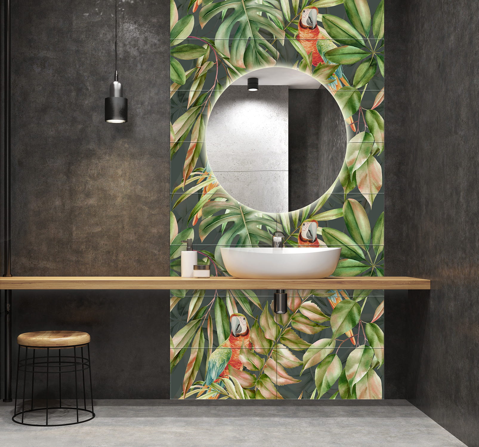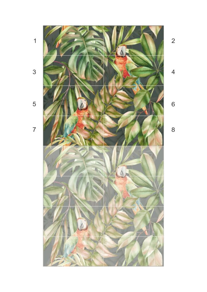 Płytki ceramiczne rektyfikowane Obraz składa się z 8 elementów Wymiar pojedynczej płytki 30×60 cm Wymiar obrazu w całości 120×120 cm Płytka ścienna rektyfikowana Obraz ceramiczny Papugi 120×120 cm Egzotyczna energia i tropikalny klimat — dekoracja ściany z pazurem Papugi 120×120 to dekoracyjny panel ceramiczny, który po ułożeniu z 8 płytek 30×60 cm tworzy spójną kompozycję ścienną. Głównym motywem są kolorowe papugi na tle tropikalnej roślinności — dzięki czemu wnętrze zyskuje żyw
