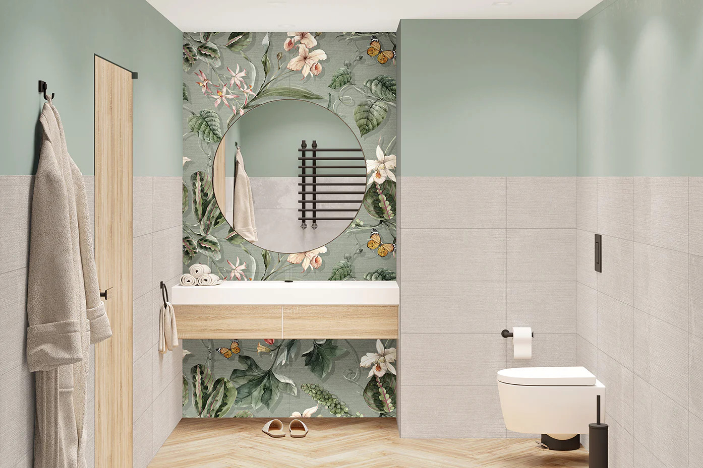 Obraz wielkoformatowy Obraz składa się z 8 elementów Wymiar pojedynczej płytki 30×60 cm Wymiar obrazu w całości 120×120 cm Płytki ceramiczne rektyfikowane Obraz ceramiczny Canva Botanica 120×120 cm Naturalny motyw botaniczny — dekoracyjna ściana pełna zieleni Canva Botanica to dekoracyjny panel ścienny, który po ułożeniu z 8 płytek 30×60 cm tworzy spójną całość o wymiarach 120×120 cm. Motyw botaniczny z liśćmi, roślinami i subtelną grafiką wprowadza do wnętrza harmonię, naturalny klimat i świeżość. Idealny do łazienki, salonu, kuchni czy holu, gdzie chcemy wprowadzić przytulny i stylowy akcent inspirowany naturą. Najważniejsze cechy produktu • Format 120×120 cm — gotowy panel dekoracyjny Panel składa się z 8 płytek 30×60 cm, które po ułożeniu tworzą pełny, dekoracyjny obraz ścienny, gotowy do natychmiastowego montażu. • Ceramika prasowana i rektyfikowana o grubości 8 mm — trwałość i stabilność Solidne wykonanie gwarantuje odporność na obciążenia mechaniczne, stabilność i długoletnie użytkowanie. • Odporność na wilgoć — możliwość montażu w łazience lub kuchni Płytki można stosować również w strefach mokrych, np. w kabinie prysznicowej lub przy umywalce. • Trwały nadruk ceramiczny — odporność mechaniczna, chemiczna i termiczna Grafika naniesiona cyfrowo i wypalana w wysokiej temperaturze zapewnia trwałość kolorów, odporność na detergenty, zarysowania i zmiany temperatury. • Niepalność — klasa A1 Płytki są odporne na ogień, co pozwala na montaż także w pobliżu kominków lub urządzeń grzewczych. • Estetyka — naturalne kolory, roślinny motyw, tekstura tkaniny Tło panelu cechuje się delikatnym wzorem przypominającym tkaninę w kolorze szałwii, co dodaje głębi i elegancji. Motyw liści i kwiatów wprowadza do wnętrza spokój, świeżość i styl. Zastosowanie — gdzie Canva Botanica sprawdzi się najlepiej Łazienka / kabina prysznicowa — dekoracyjna ściana odporna na wilgoć. Salon / jadalnia / kuchnia — ściana akcentowa, która ociepla i urozmaica przestrzeń. Hol, przedpokój, korytarz — dekoracyjny element przy wejściu nadający wnętrzu charakteru. Sypialnia — stylowe tło za łóżkiem lub w strefie relaksu. Przestrzenie komercyjne / biura / lokale usługowe — trwała i efektowna dekoracja ścienna. Dlaczego warto wybrać Canva Botanica Canva Botanica łączy naturalny, dekoracyjny styl z praktycznymi właściwościami ceramiki: trwałością, odpornością na wilgoć i ogień oraz prostym montażem. Dzięki temu panel staje się idealnym wyborem dla tych, którzy chcą, by ściana była nie tylko tłem, lecz prawdziwą ozdobą wnętrza — nadającą mu charakter, przytulność i elegancję.