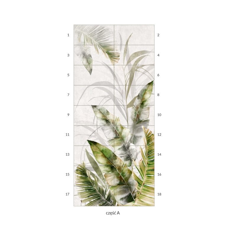 Obraz wielkoformatowy Obraz składa się z 18 elementów Wymiar pojedynczej płytki 30×60 cm Wymiar obrazu w całości 270×120 cm Płytki ceramiczne rektyfikowane Amazonia Beige A 270×120 – wielkoformatowy obraz ceramiczny Tropikalna dekoracja z naturą w tle Amazonia Beige A to dekoracyjny panel ceramiczny, który po ułożeniu tworzy jednolitą, efektowną ścianę o wymiarach 270×120 cm. Motyw tropikalnych liści na ciepłym, beżowo‑zielonym tle wnosi do wnętrza klimat natury, elegancj