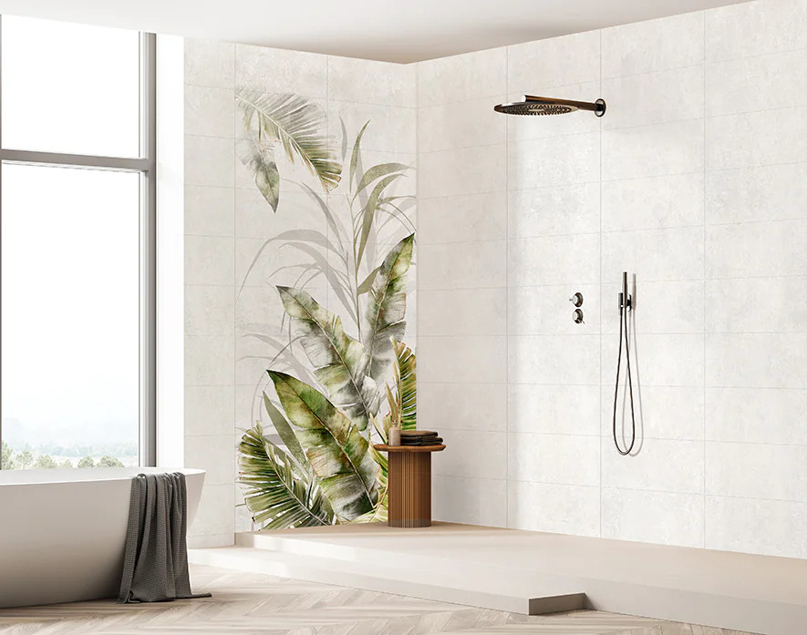Obraz wielkoformatowy Obraz składa się z 18 elementów Wymiar pojedynczej płytki 30×60 cm Wymiar obrazu w całości 270×120 cm Płytki ceramiczne rektyfikowane Amazonia Beige A 270×120 – wielkoformatowy obraz ceramiczny Tropikalna dekoracja z naturą w tle Amazonia Beige A to dekoracyjny panel ceramiczny, który po ułożeniu tworzy jednolitą, efektowną ścianę o wymiarach 270×120 cm. Motyw tropikalnych liści na ciepłym, beżowo‑zielonym tle wnosi do wnętrza klimat natury, elegancji i spokoju. To idealne rozwiązanie do łazienek, salonów, sypialni, holi albo przestrzeni użytkowych, które mają zyskać dekoracyjny akcent. Kluczowe cechy produktu • Duży format – 270×120 cm Dekor składa się z 18 płytek (każda 30×60 cm), co pozwala uzyskać spójną powierzchnię, przypominającą obraz — idealną jako główna dekoracja ściany. • Wysokiej jakości ceramika i rektyfikacja Płytki są ceramiczne, rektyfikowane i mają grubość 8 mm, co gwarantuje stabilny montaż i eleganckie wykończenie powierzchni. • Trwały nadruk ceramiczny Grafika nanoszona jest cyfrowo i wypalana w wysokiej temperaturze, co zapewnia odporność mechaniczną, chemiczną i termiczną. Kolory pozostają żywe, a powierzchnia odporna na trwałe zabrudzenia czy ścieranie. Ceramik Studio • Odporność na wilgoć i możliwość montażu w łazience Płytki mają odpowiednie parametry, by można je było stosować także w pomieszczeniach mokrych — np. w łazience lub strefie prysznicowej. Ceramik Studio • Odporność ogniowa – klasa A1 Produkt jest niepalny, co umożliwia bezpieczne zastosowanie nawet w pobliżu źródeł ciepła, takich jak kominek czy kuchenka. Ceramik Studio • Łatwy montaż i szeroka kompatybilność Obraz można montować przy użyciu standardowych klejów do płytek ceramicznych. Zalecana fuga to minimum 2 mm, co pozwala na elastyczne dopasowanie do różnych projektów. Ceramik Studio • Estetyczny, naturalny motyw tropikalny Liście w odcieniach zieleni, beżu, szarości i czerni na neutralnym tle tworzą subtelny, ale dekoracyjny efekt — idealny dla wnętrz z charakterem i naturą. Ceramik Studio Gdzie najlepiej zastosować Amazonia Beige A w łazienkach, również w strefach mokrych — dzięki odporności na wilgoć, w salonach i sypialniach — jako efektowna ściana dekoracyjna lub tło, w korytarzach, przedpokojach, holach — jako reprezentacyjna dekoracja ścienna, w kuchniach — jako dekoracyjna zabudowa lub ściana nad blatem, przy zachowaniu warunków montażu, w przestrzeniach komercyjnych — biura, hotele, restauracje — gdzie ważne są trwałość i styl. Dlaczego warto włączyć Amazonia Beige A do oferty sklepu Amazonia Beige A to produkt, który łączy estetykę dekoracyjnego panelu ściennego z funkcjonalnością ceramiki. Duży format, tropikalna grafika i wysoka odporność materiału sprawiają, że dekor nada wnętrzu charakteru i elegancji, a jednocześnie będzie trwały i praktyczny przez wiele lat. Taka propozycja może zainteresować klientów poszukujących unikatowych, dekoracyjnych rozwiązań zamiast standardowych płytek.