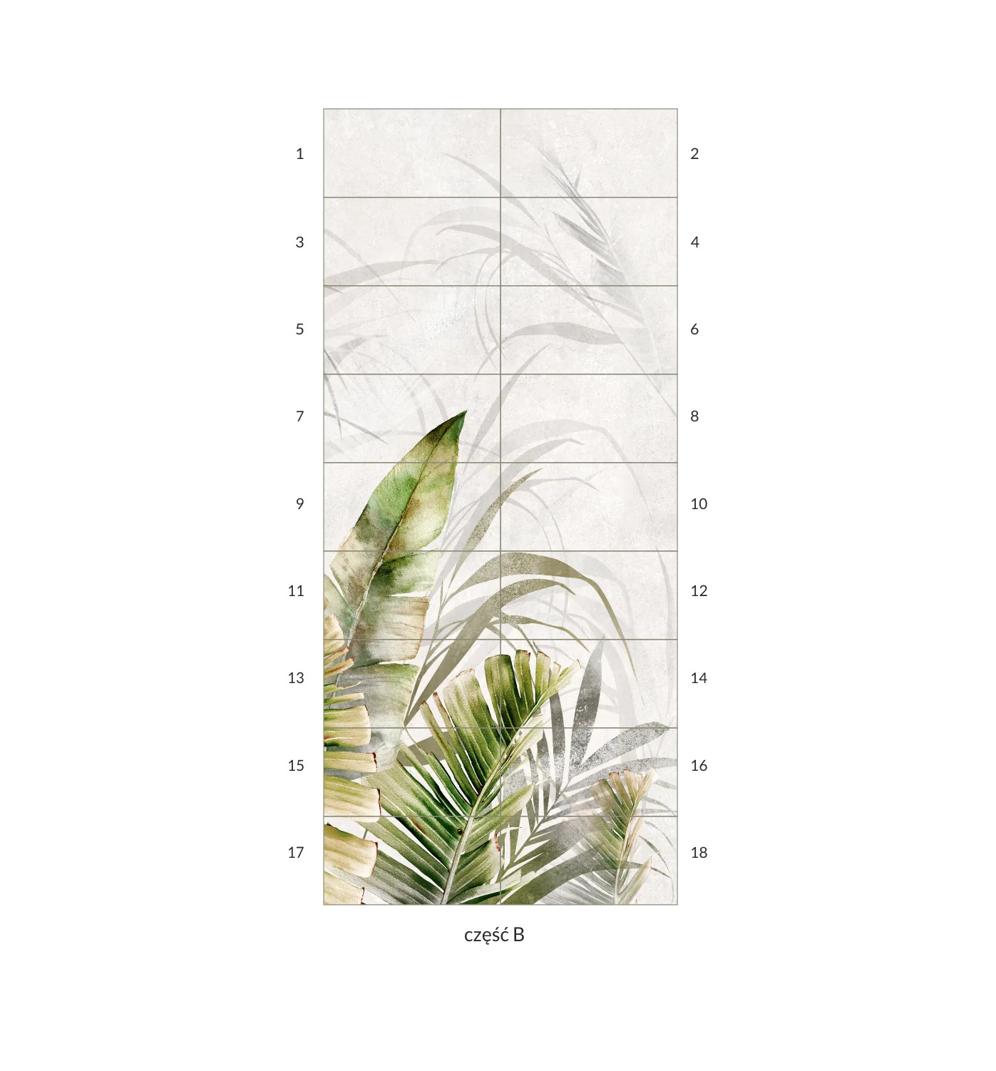 Obraz wielkoformatowy Obraz składa się z 18 elementów Wymiar pojedynczej płytki 30×60 cm Wymiar obrazu w całości 270×120 cm Płytki ceramiczne rektyfikowane Obraz wielkoformatowy Amazonia Beige B 270×120 cm Tropikalny motyw i elegancka dekoracja wnętrz Amazonia Beige B to dekoracyjny panel ceramiczny, który po ułożeniu tworzy spójną powierzchnię ścienną o wymiarach 270×120 cm. Motyw tropikalnych liści na ciepłym, beżowym tle wnosi do wnętrza naturalny charakter, subtelną e