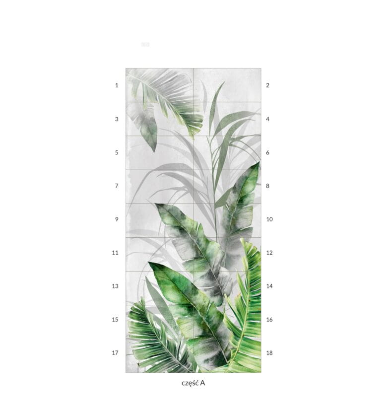 Obraz wielkoformatowy Obraz składa się z 18 elementów Wymiar pojedynczej płytki 30×60 cm Wymiar obrazu w całości 270×120 cm Płytki ceramiczne rektyfikowane Obraz ceramiczny Amazonia Grey A 270×120 cm Dekoracyjny panel z tropikalnym motywem Amazonia Grey A to wielkoformatowa płytka ceramiczna, która po ułożeniu tworzy efektowny panel o wymiarach 270×120 cm. Motyw tropikalnych liści w odcieniach szarości i zieleni wprowadza do wnętrza naturalny charakter, świeżość i unika