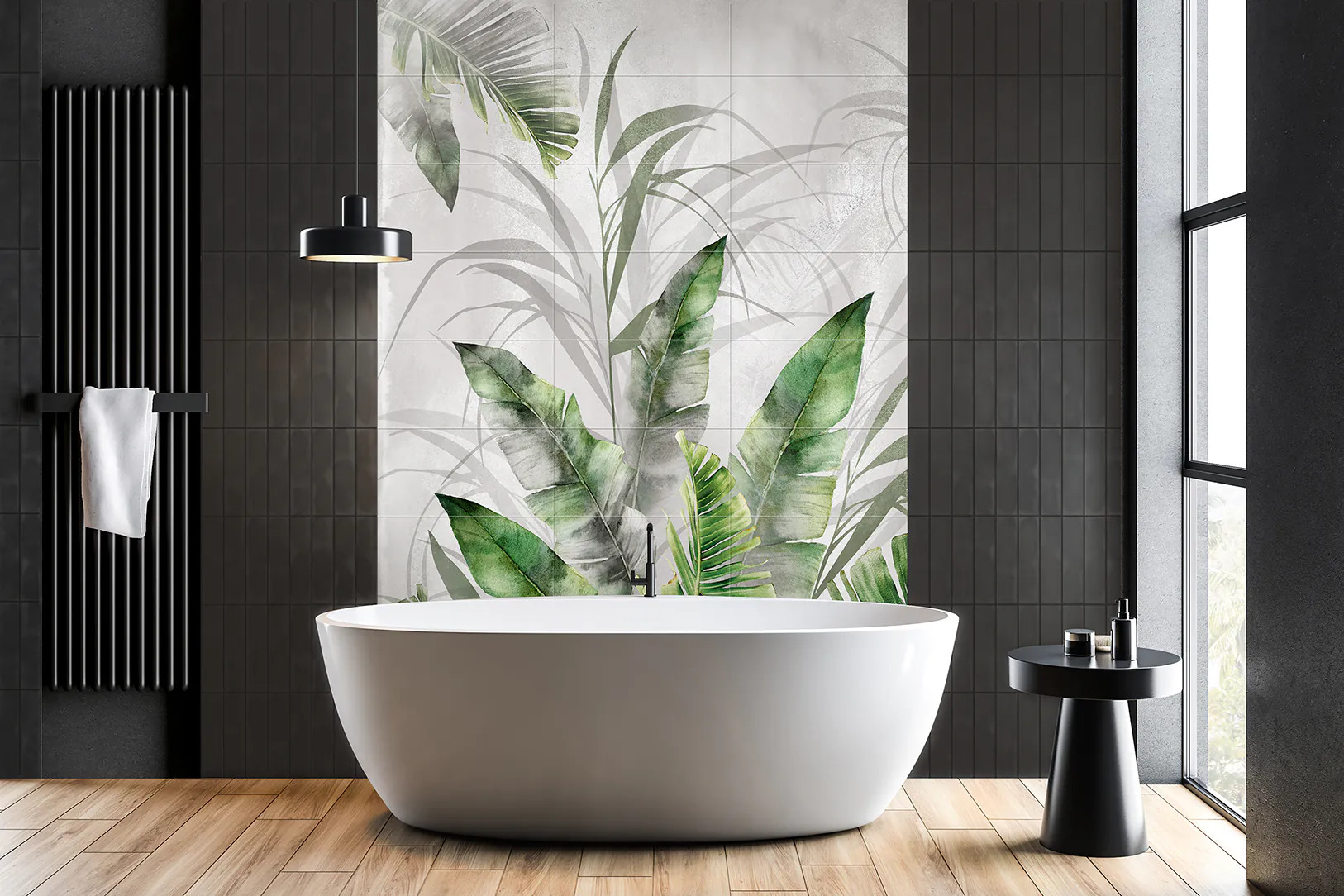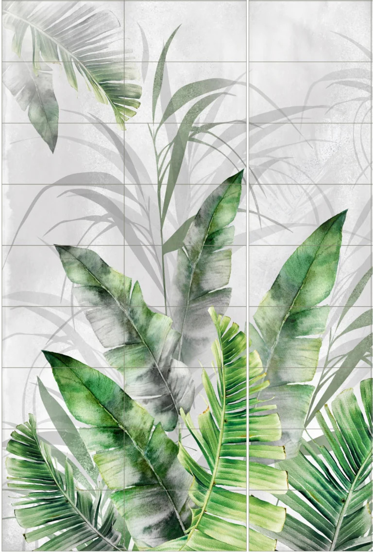 Obraz wielkoformatowy Obraz składa się z 27 elementów Wymiar pojedynczej płytki 30×60 cm Wymiar obrazu w całości 270×180 cm Płytka rektyfikowana Amazonia Grey Large – wielkoformatowa płytka ceramiczna / obraz ścienny 270×180 cm Dekoracyjny motyw tropikalnej natury dla nowoczesnych wnętrz Amazonia Grey Large to elegancka, dekoracyjna płytka ceramiczna, która po ułożeniu tworzy dużą, spójną kompozycję 270×180 cm. Subtelna kolorystyka — odcienie