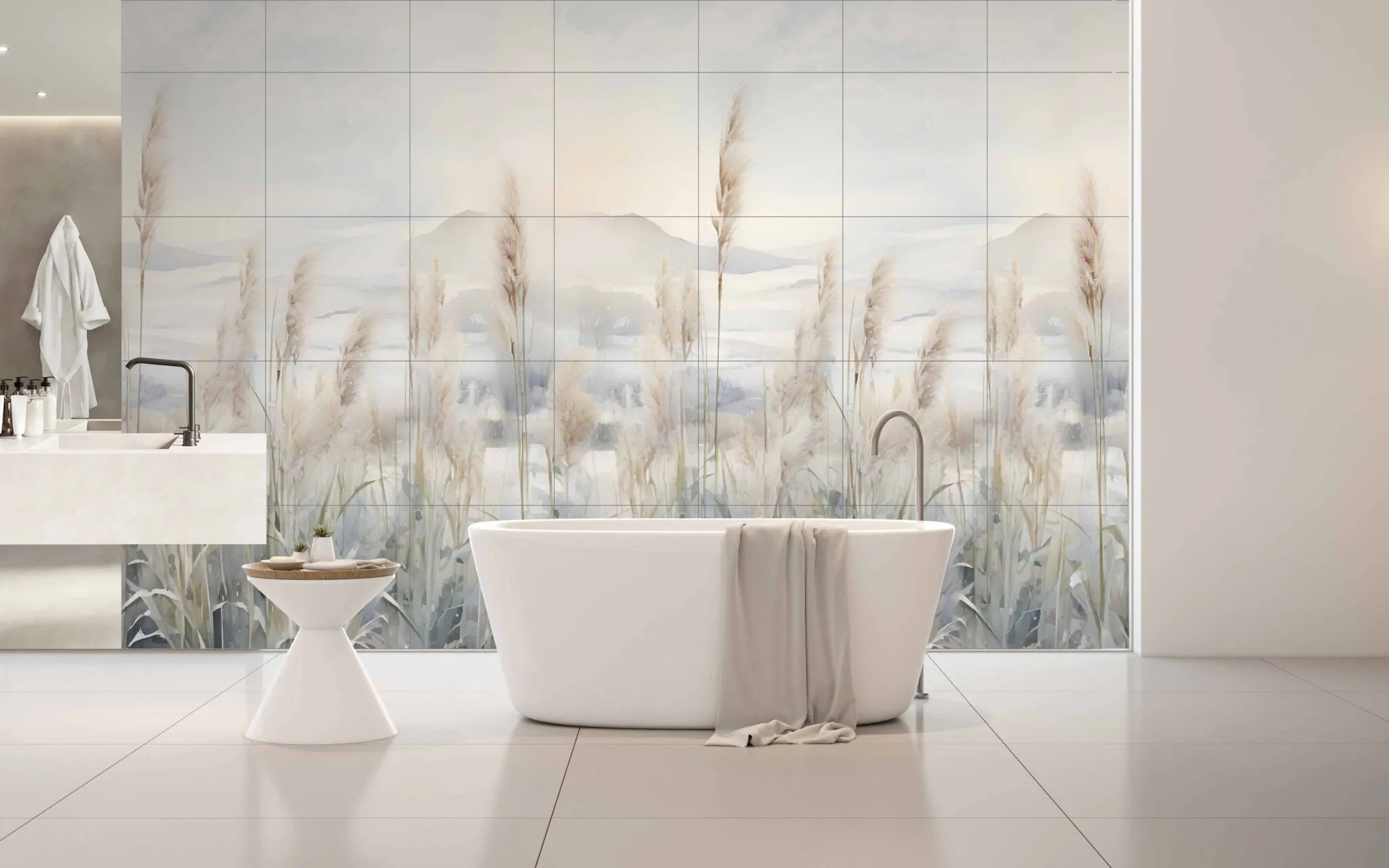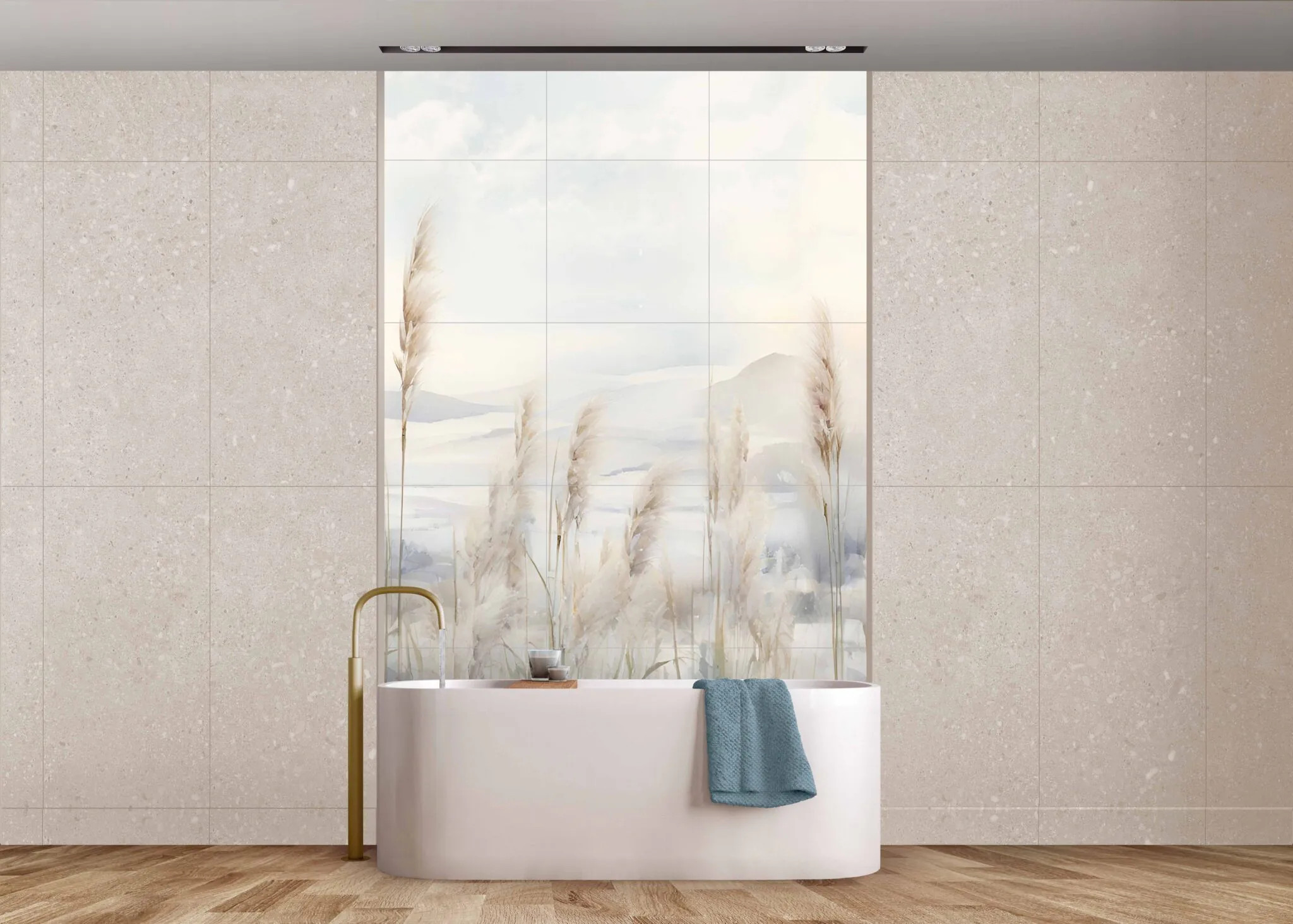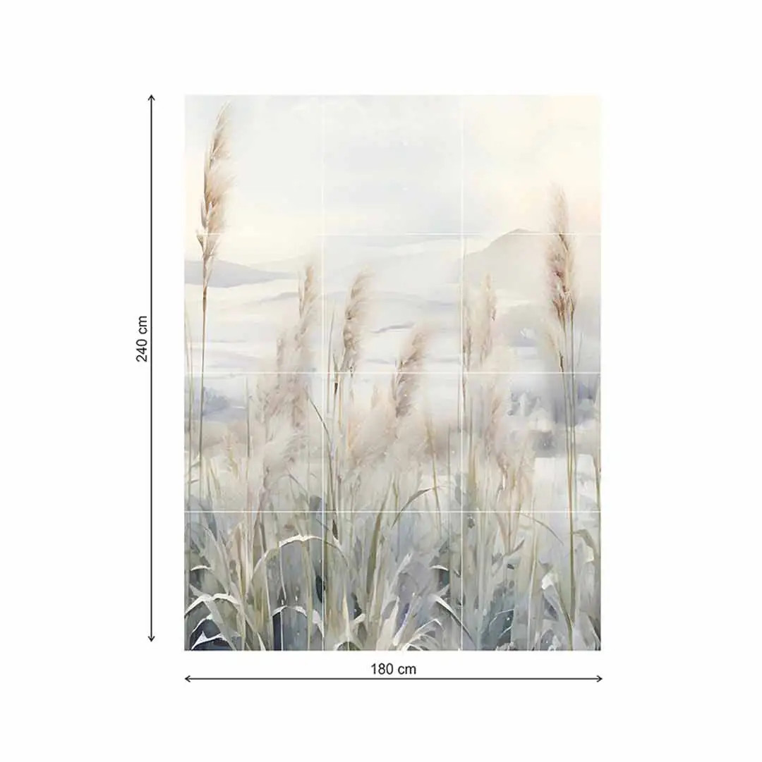 Czyszczenie: łagodne detergenty + miękka ściereczka . Nie stosować szorstkich gąbek. Obraz wielkoformatowy gres Pampas 300×180 cm – naturalna elegancja w nowoczesnym wnętrzu Wyjątkowa dekoracja ścienna z gresu Obraz wielkoformatowy Pampas 300×180 cm to połączenie sztuki i funkcjonalności. Wykonany z najwyższej jakości gresu, składa się z 15 płytek o wymiarach 60×60 cm, które po ułożeniu tworzą spójną kompozycję inspirowaną naturą. Motyw delikatnych źdźbeł trawy pampasowej w odcieniach beżu i szarości wprowadza do wnętrza harmonię, spokój i lekkość. Styl i przeznaczenie Dekoracja Pampas doskonale sprawdza się we wnętrzach w stylu boho, skandynawskim, naturalnym oraz minimalistycznym. Idealnie komponuje się z drewnem, jasnymi kolorami i naturalnymi tkaninami. Świetnie wygląda w salonie, jadalni, sypialni czy przestrzeni wellness, gdzie pełni rolę głównego elementu dekoracyjnego. Trwałość i jakość wykonania Płytki gresowe użyte do stworzenia obrazu charakteryzują się: Niską nasiąkliwością (Eb ≤ 0,5%), co gwarantuje odporność na wilgoć. Wysoką wytrzymałością mechaniczną i odpornością na ścieranie. Odpornością chemiczną i termiczną – mogą być montowane także w pobliżu kominków czy kuchenek. Klasa ognioodporności A1, zapewniająca bezpieczeństwo użytkowania. To produkt klasy premium, który zachowa swój wygląd przez długie lata, niezależnie od warunków eksploatacji. Montaż i pielęgnacja Obraz Pampas montuje się przy użyciu klasycznych klejów do płytek ceramicznych klasy C1 lub C1T. Zalecana fuga ma szerokość minimum 2 mm.