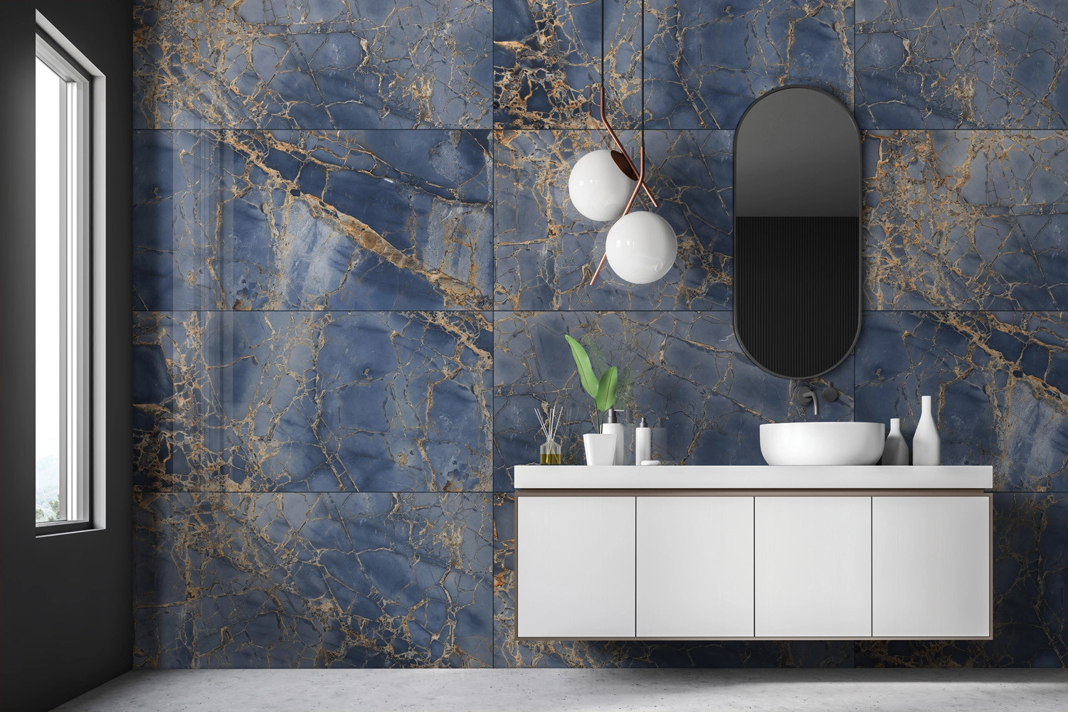 EGEN KAZAN GOLD BLUE 60×120 GRIT GRANULA – niebieski marmur ze złotem, który wnosi chłód morza i luksus premium Chcesz wnętrze pełne elegancji, głębi i subtelnego blasku? EGEN KAZAN GOLD BLUE 60×120 GRIT GRANULA to perełka kolekcji Kazan – głęboki, wodnisty niebieski marmur z wyraźną, złotą żyłą, która dodaje ciepła i luksusu na chłodnym tle. Wykończenie GRIT GRANULA daje wyczuwalną strukturę (antyposlizgową w praktyce) + subtelny, elegancki połysk – płytka wygląda i czuć jak naturalny kamień