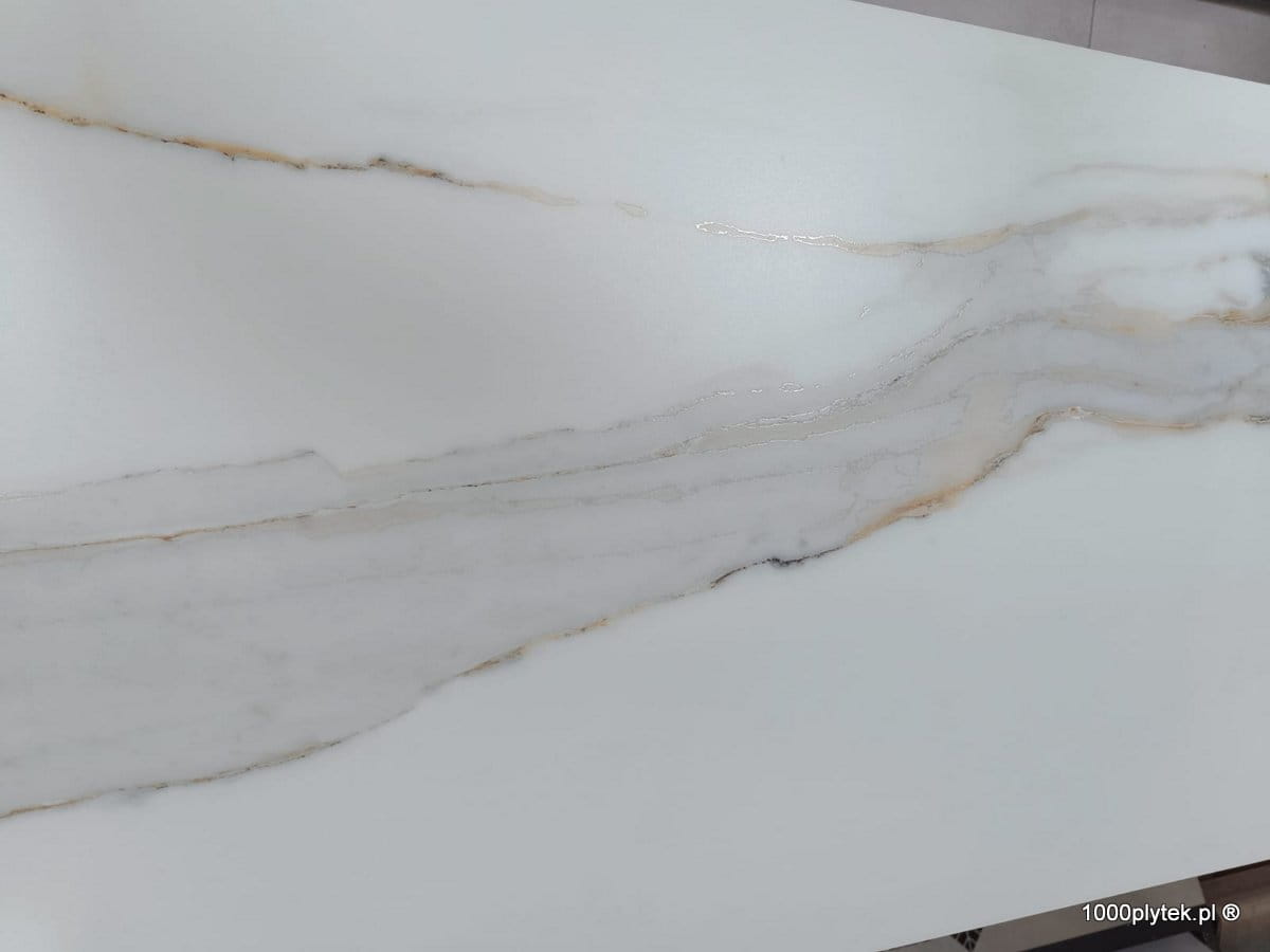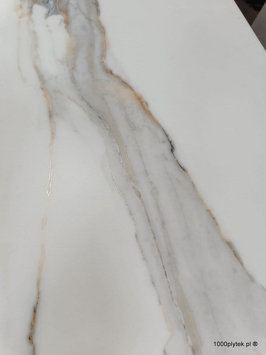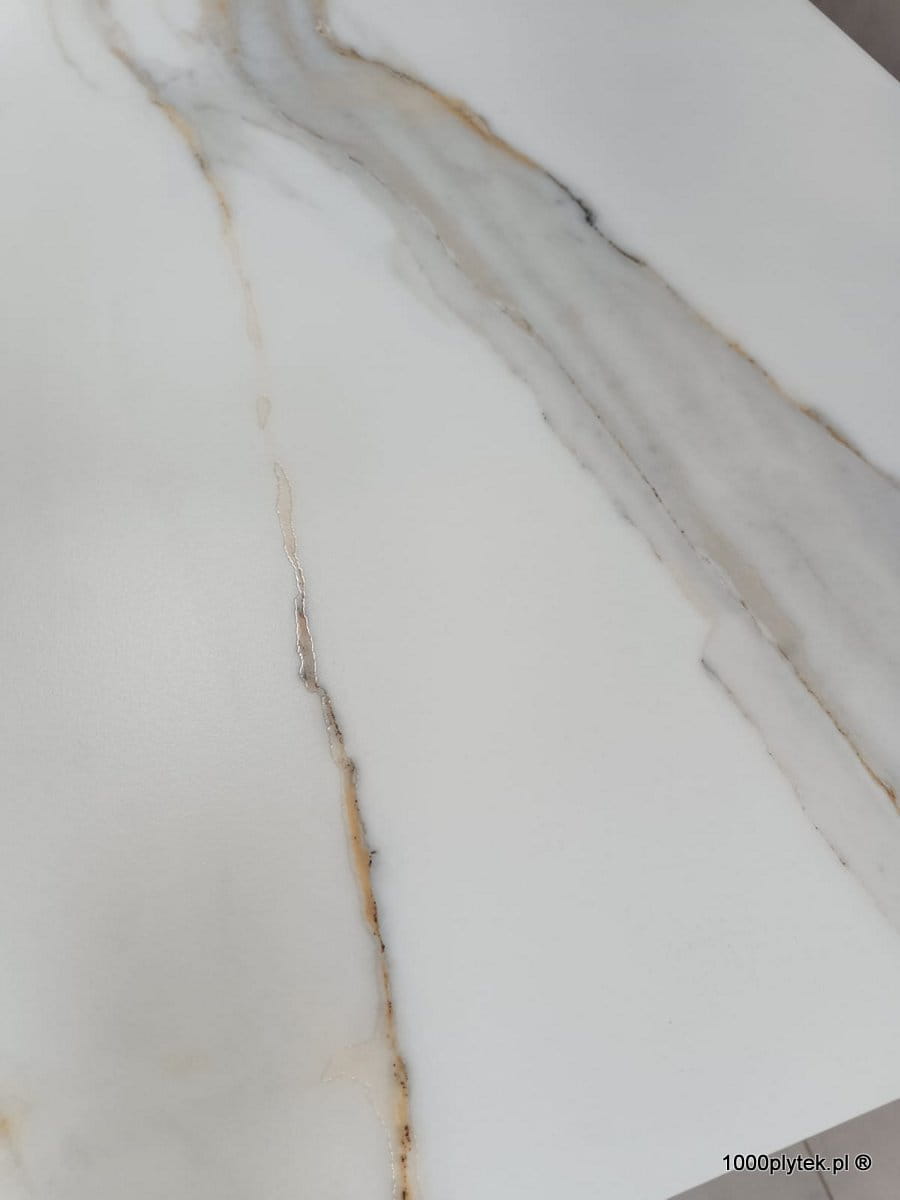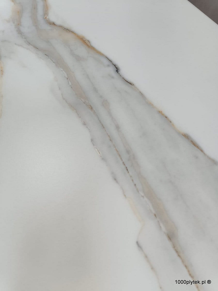 Gres Soul Gold 60×120 cm – marmur w złotym wydaniu z carvingiem To wielkoformatowy gres szkliwiony w bazowej, śnieżnobiałej tonacji z wyraźnymi, szarymi żyłami i subtelnymi złotawymi akcentami – klasyczny marmur w nowoczesnej, luksusowej wersji. Powierzchnia matowa z efektem carving (wyczuwalne 3D-żłobienia) sprawia, że płytka wygląda i czuć ją jak naturalny kamień – żyły połyskują pod różnym kątem światła, dając bardzo realistyczny efekt. Rektyfikowane krawędzie pozwalają na montaż z bardzo wą