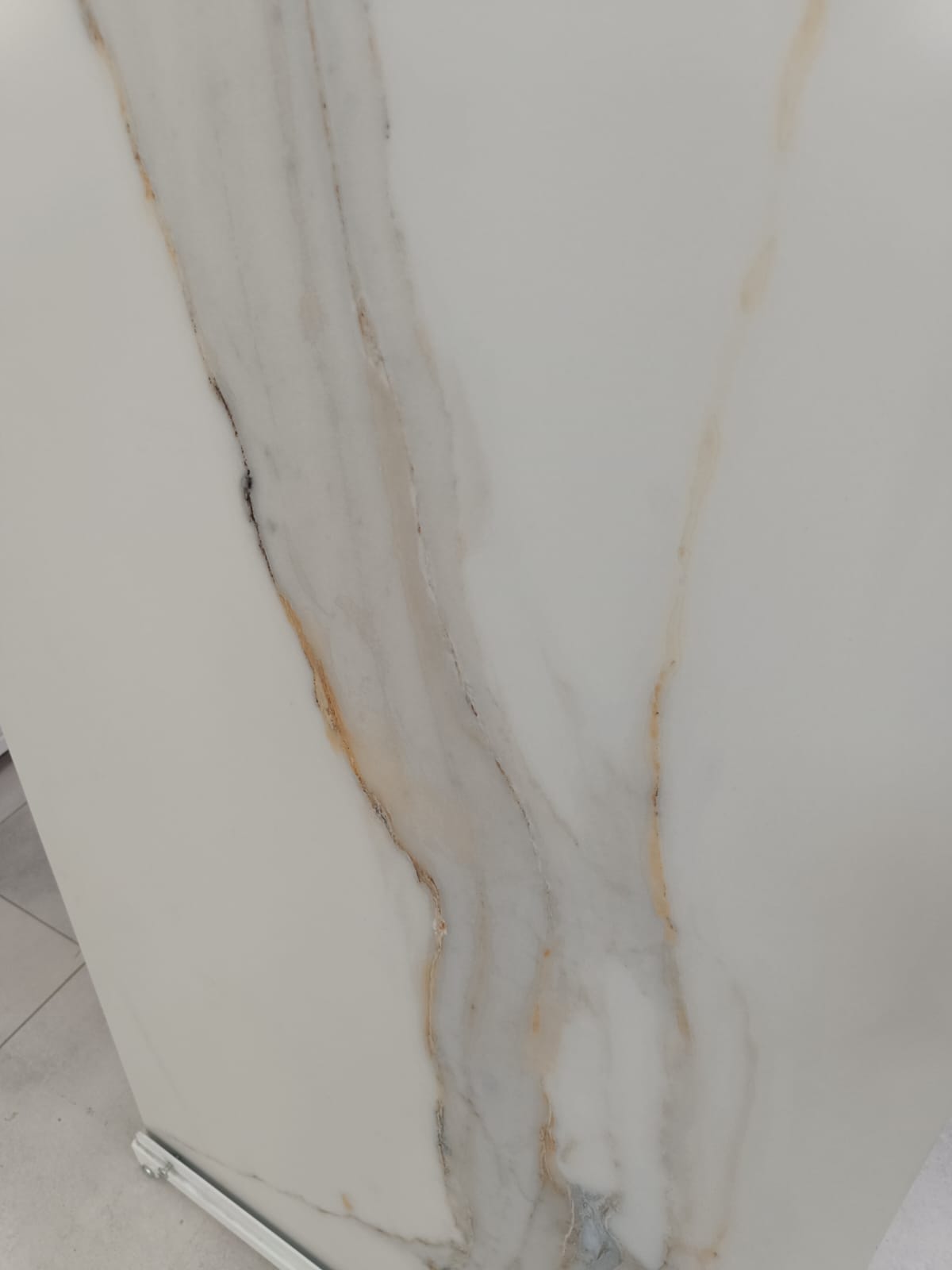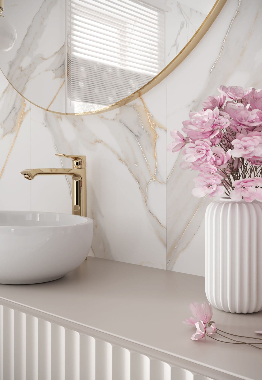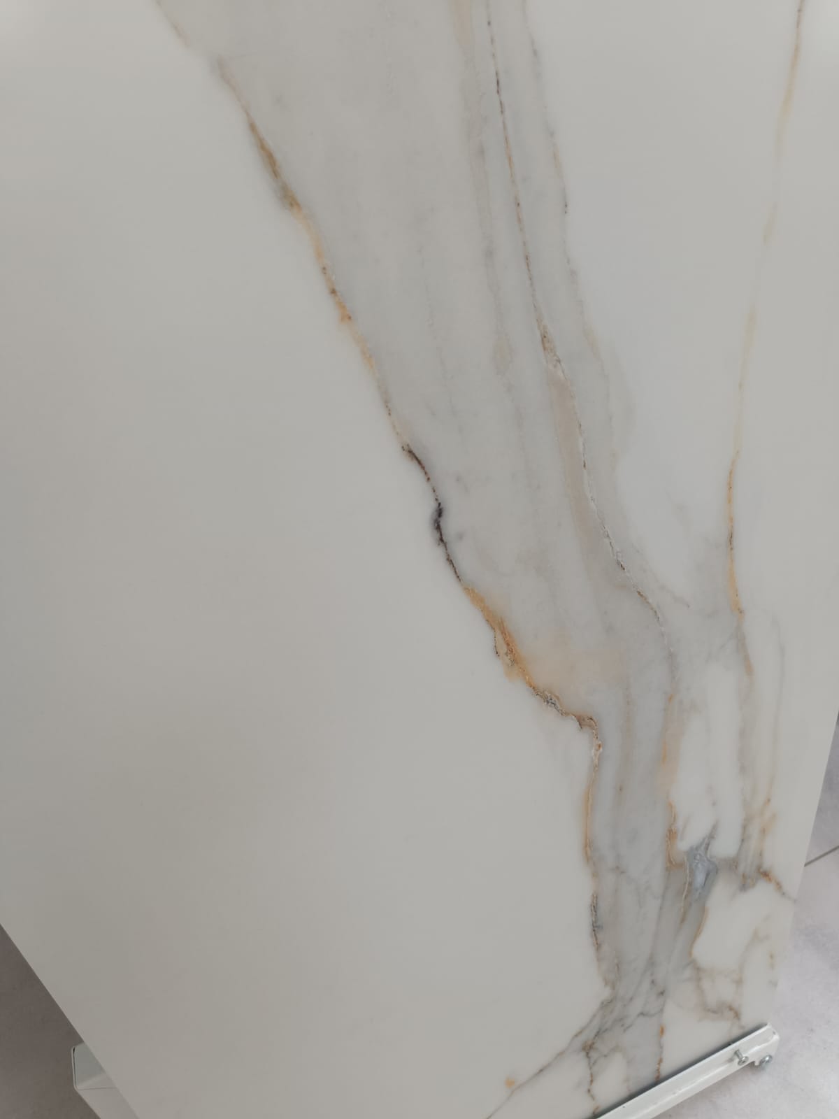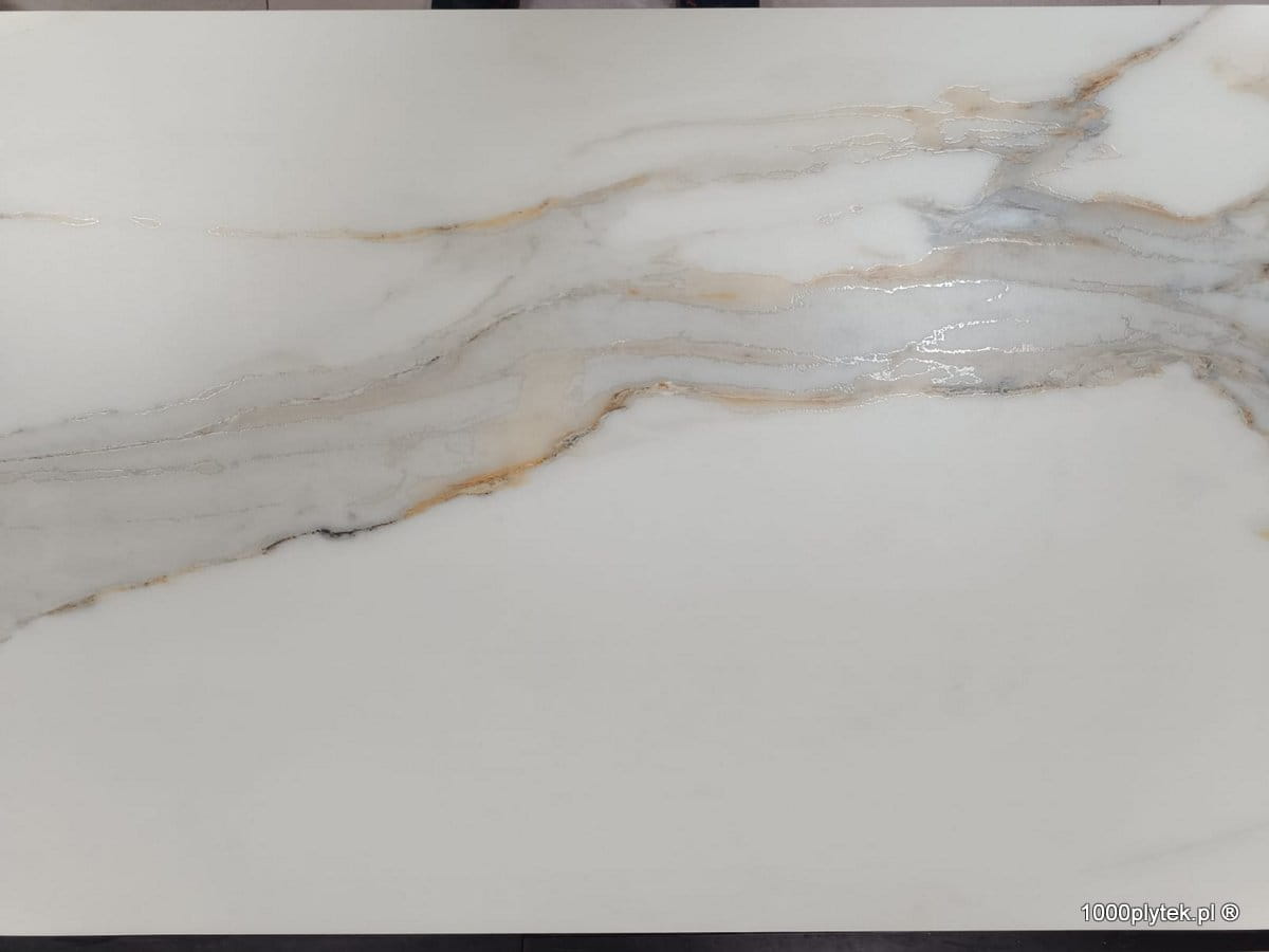 Gres Soul Gold 60×120 cm – marmur w złotym wydaniu z carvingiem To wielkoformatowy gres szkliwiony w bazowej, śnieżnobiałej tonacji z wyraźnymi, szarymi żyłami i subtelnymi złotawymi akcentami – klasyczny marmur w nowoczesnej, luksusowej wersji. Powierzchnia matowa z efektem carving (wyczuwalne 3D-żłobienia) sprawia, że płytka wygląda i czuć ją jak naturalny kamień – żyły połyskują pod różnym kątem światła, dając bardzo realistyczny efekt. Rektyfikowane krawędzie pozwalają na montaż z bardzo wą