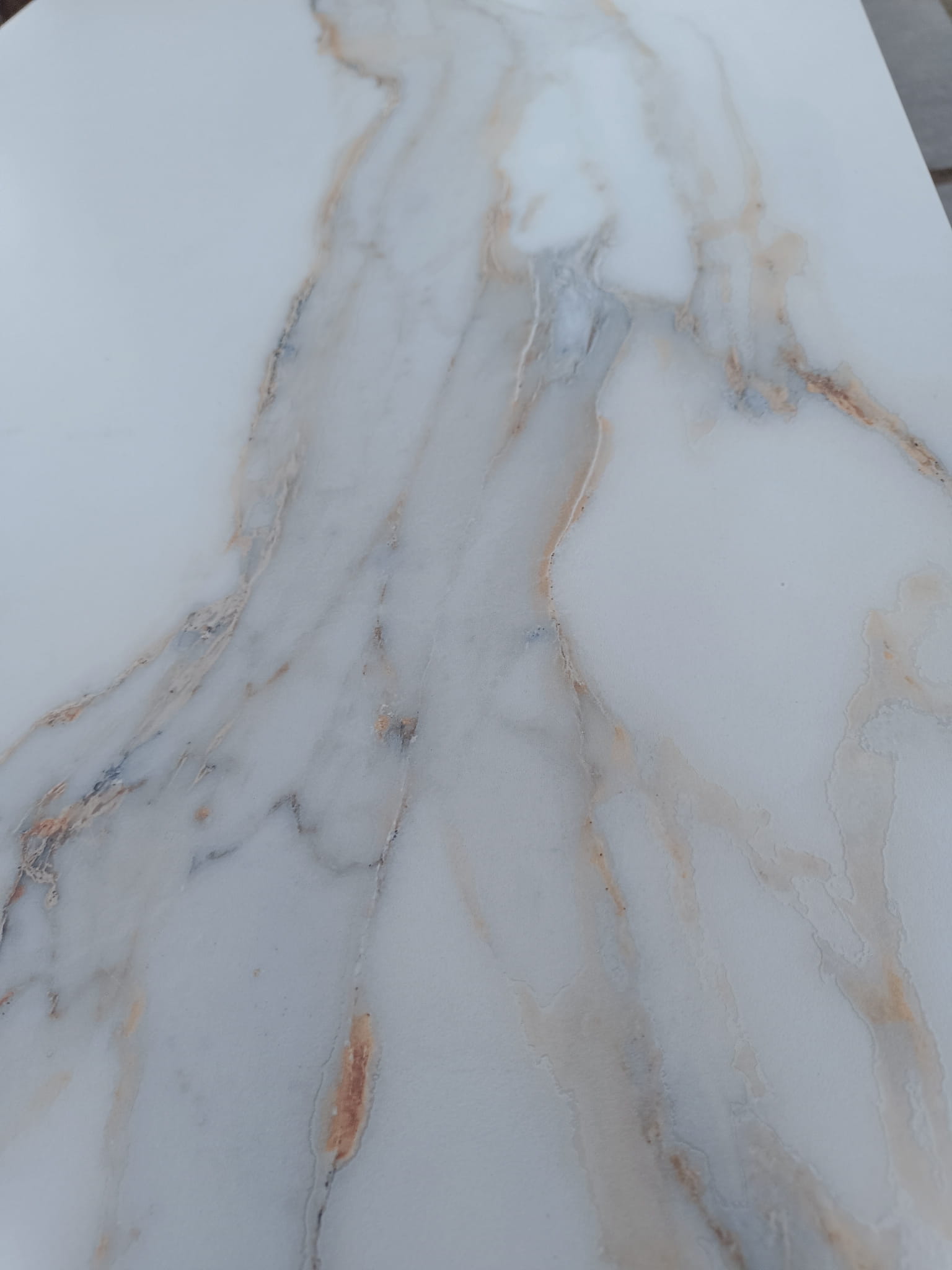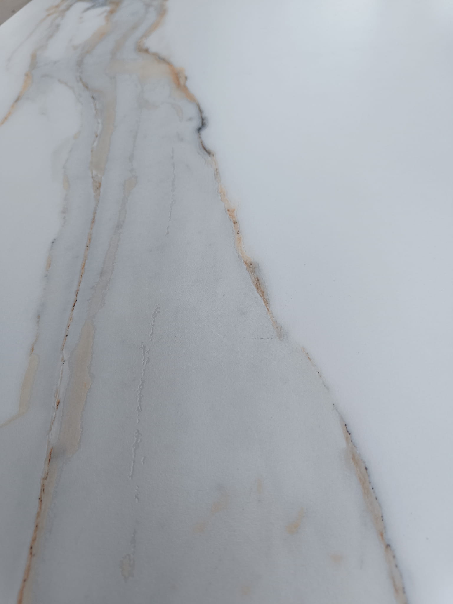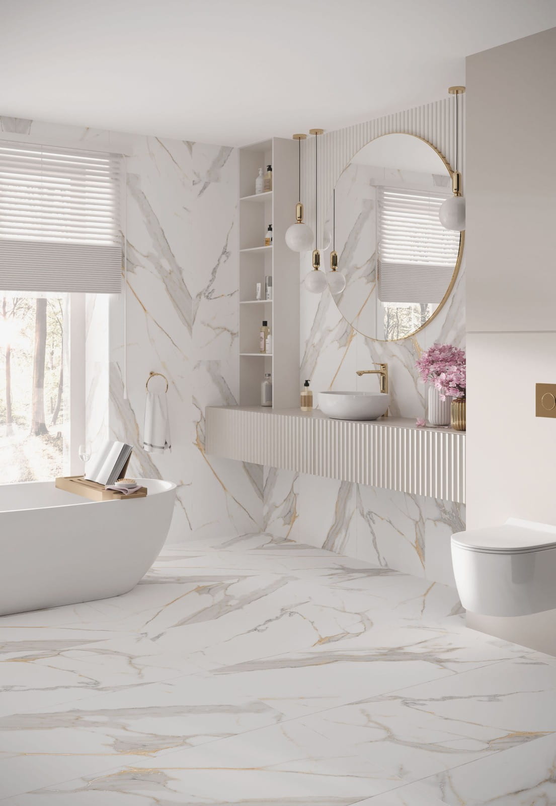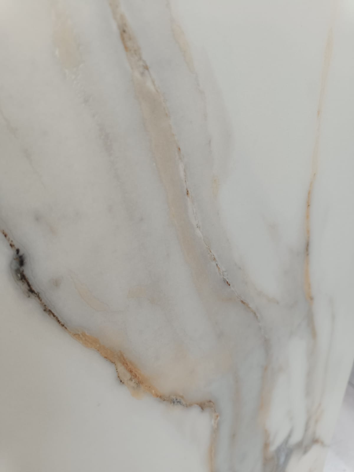 Gres Soul Gold 60×120 cm – marmur w złotym wydaniu z carvingiem To wielkoformatowy gres szkliwiony w bazowej, śnieżnobiałej tonacji z wyraźnymi, szarymi żyłami i subtelnymi złotawymi akcentami – klasyczny marmur w nowoczesnej, luksusowej wersji. Powierzchnia matowa z efektem carving (wyczuwalne 3D-żłobienia) sprawia, że płytka wygląda i czuć ją jak naturalny kamień – żyły połyskują pod różnym kątem światła, dając bardzo realistyczny efekt. Rektyfikowane krawędzie pozwalają na montaż z bardzo wą