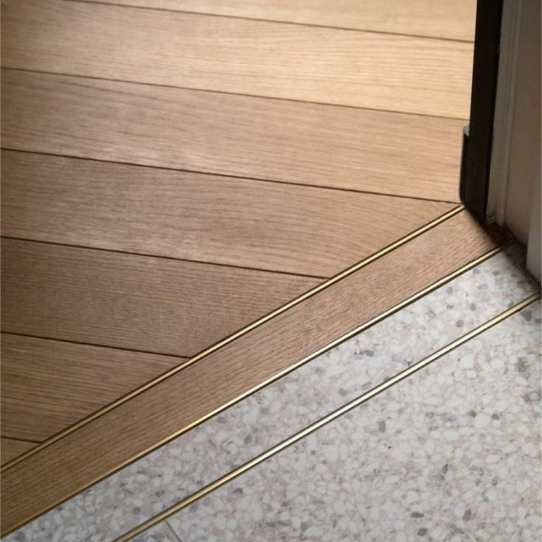 Listwy podłogowe mosiężne typu „L” to listwy progowe przeznaczone do estetycznego wykończenia i maskowania połączeń pomiędzy dwoma rodzajami posadzek znajdujących się na tym samym poziomie. Stanowią eleganckie i trwałe rozwiązanie wszędzie tam, gdzie wymagane jest czyste, wyraźne oddzielenie dwóch stref – np. między płytkami a parkietem itp.