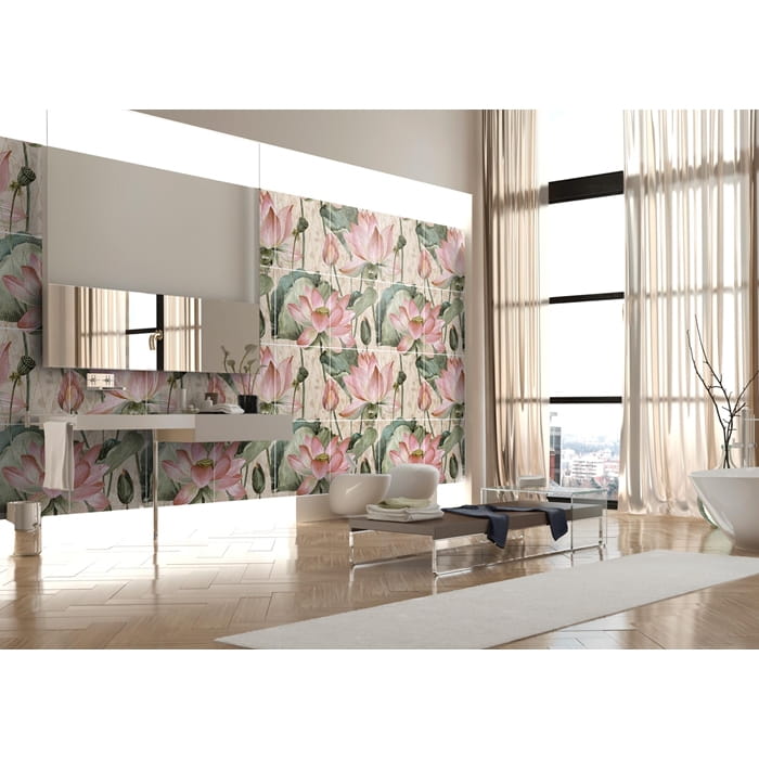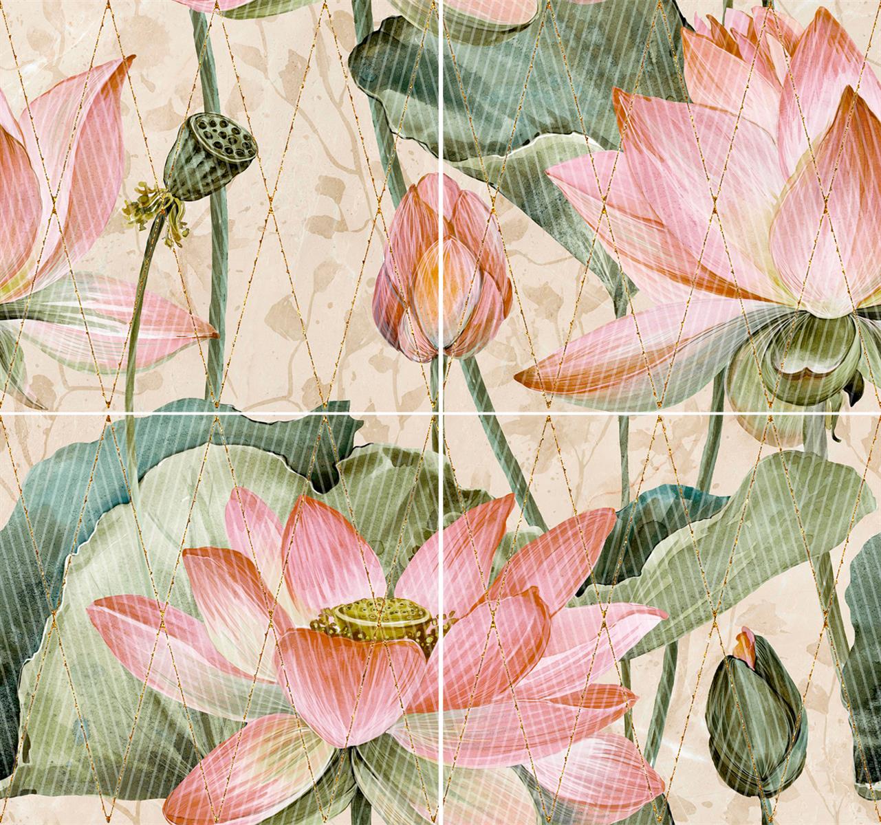 Mural gresowy Lotos 4‑elementowy Mat 120×120 – majestatyczny lotos w dużym formacie Mural gresowy Lotos 4‑elementowy Mat 120×120 to dekoracyjna kompozycja stworzonaja z czterech płyt 120×120 cm, która prezentuje pełny motyw kwiatu lotosu. Dzięki matowemu wykończeniu i precyzyjnemu nadrukowi cyfrowemu, mural wprowadza do wnętrza elegancję, harmonię i delikatny akcent roślinny przy minimalnej liczbie fug. Cechy techniczne i zalety Format 120 × 120 cm (4 płyty) – duży format daje efekt nie