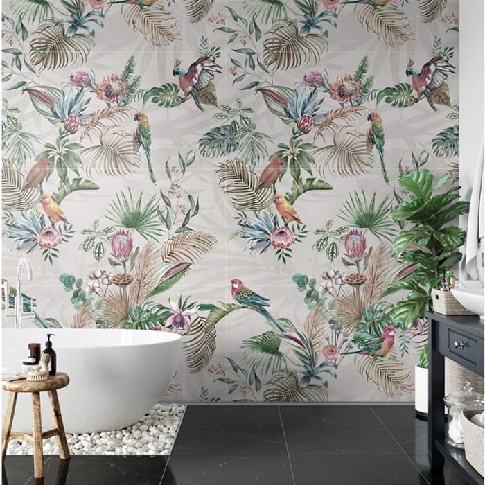 Mural gresowy Eden Grey 6/6 Mat 60×60 – ostatni element dekoracyjnej kompozycji Mural gresowy Eden Grey 6/6 Mat 60×60 to szósty panel sześcioczęściowego muralu z motywem papug i roślin w stonowanych odcieniach szarości. Jest to element dopełniający całą kompozycję, tworzący spójną, harmonijną dekorację ścienną. Najważniejsze cechy produktu Format: 60 × 60 cm – pasuje do pozostałych części muralu, umożliwiając pełne wykończenie dekoracji. Materiał: gres – trwały i odporny na wilgoć oraz uszkodzenia. Powierzchnia: matowa – elegancka, subtelna i praktyczna w codziennym użytkowaniu. Krawędzie: rektyfikowane – umożliwiają montaż z minimalną fugą, dla efektu jednolitej ściany. Technologia druku: cyfrowa – realistyczne odwzorowanie papug i roślinności. Grubość: 9 mm – typowa dla dekorów muralowych. Zastosowanie: ściany wewnętrzne – idealne do łazienek, salonów, sypialni i holi. Mrozoodporność: tak – trwałość również przy zmiennych warunkach temperaturowych. Zastosowanie w aranżacji wnętrz Łazienka – dopełnia dekorację nad wanną lub w strefie prysznica. Salon – fragment ściany za meblami, wprowadzający naturalny i elegancki akcent. Przedpokój – punkt centralny dekoracji, który podkreśla styl wnętrza. Sypialnia lub gabinet – tworzy spokojną i harmonijną atmosferę, idealną do relaksu. Dlaczego warto wybrać Eden Grey 6/6 Mat Zapewnia pełny efekt muralowy jako końcowy element serii. Stylowy motyw natury z papugami i roślinnością w szarościach. Trwałość gresu gwarantuje długowieczność dekoracji. Łatwe czyszczenie dzięki matowej powierzchni. Podsumowanie Mural gresowy Eden Grey 6/6 Mat 60×60 to elegancka płytka dekoracyjna, dopełniająca kompletną muralową kompozycję. Idealna do wnętrz, w których ceniona jest naturalna estetyka, spokój i styl w nowoczesnym wydaniu.