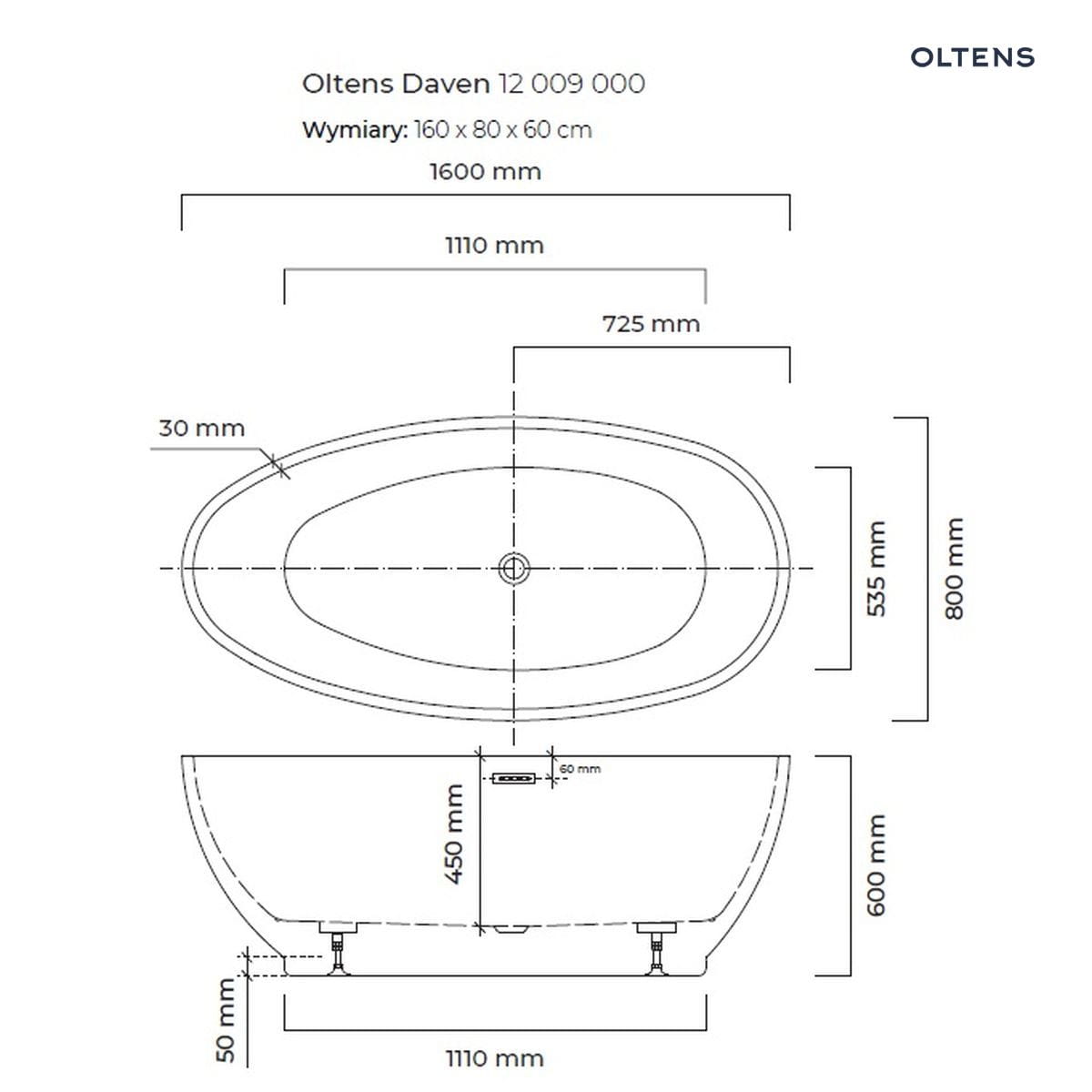 Oltens Daven wanna wolnostojąca 160×80 cm owalna akrylowa biała 12009000