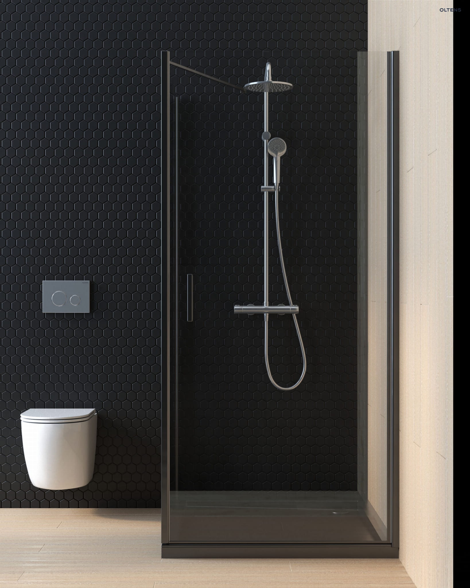Oltens Hallan ścianka prysznicowa 80 cm boczna do drzwi czarny mat/szkło przezroczyste 22100300