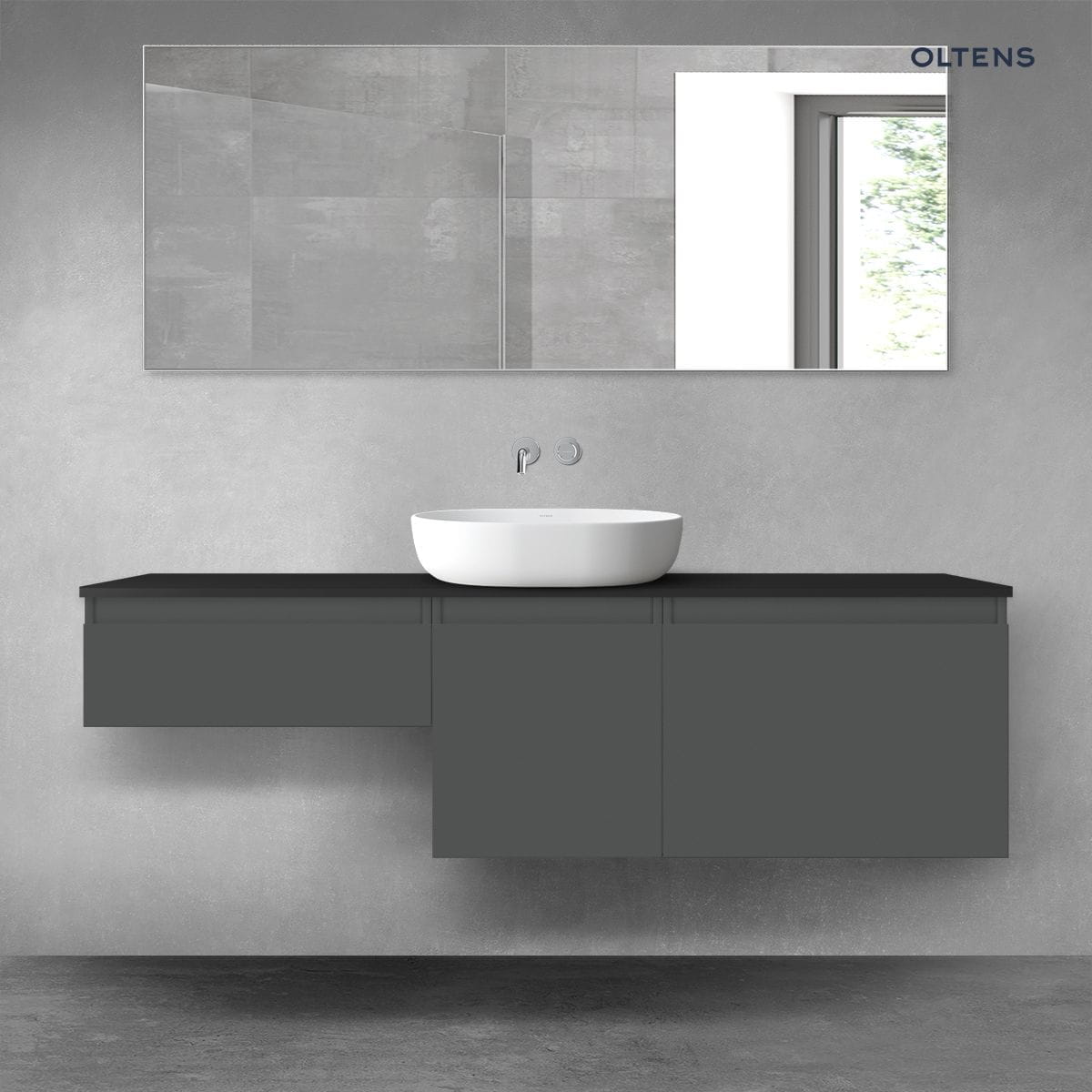 – wisząca szafka podumywalkowa – materiał: płyta MDF, powłoka lakierowana odporna na promieniowanie UV – szerokość 40 cm – głębokość 45,6 cm – wysokość 47 cm – prowadnice: pełen wysuw – szuflada z systemem Oltens SoftClose – kolor grafit mat