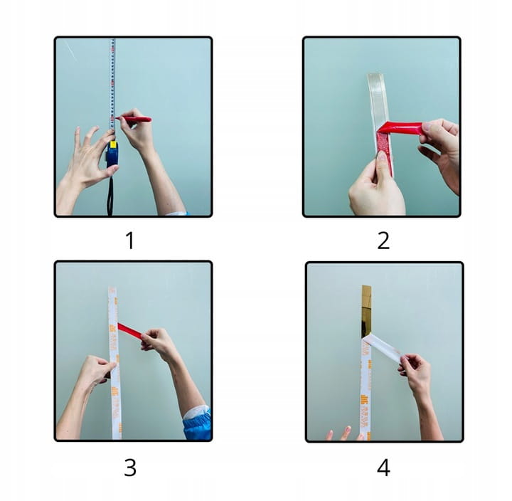 Dociśnij listwę na całej powierzchni aby klej w każdym miejscu odpowiednio związał. Pamiętaj, aby przy montażu temperatura otoczenia i przedmiotu była powyżej 15 stopni pozwoli to dobrze i trwale związać podłoże materiału i taśmy.