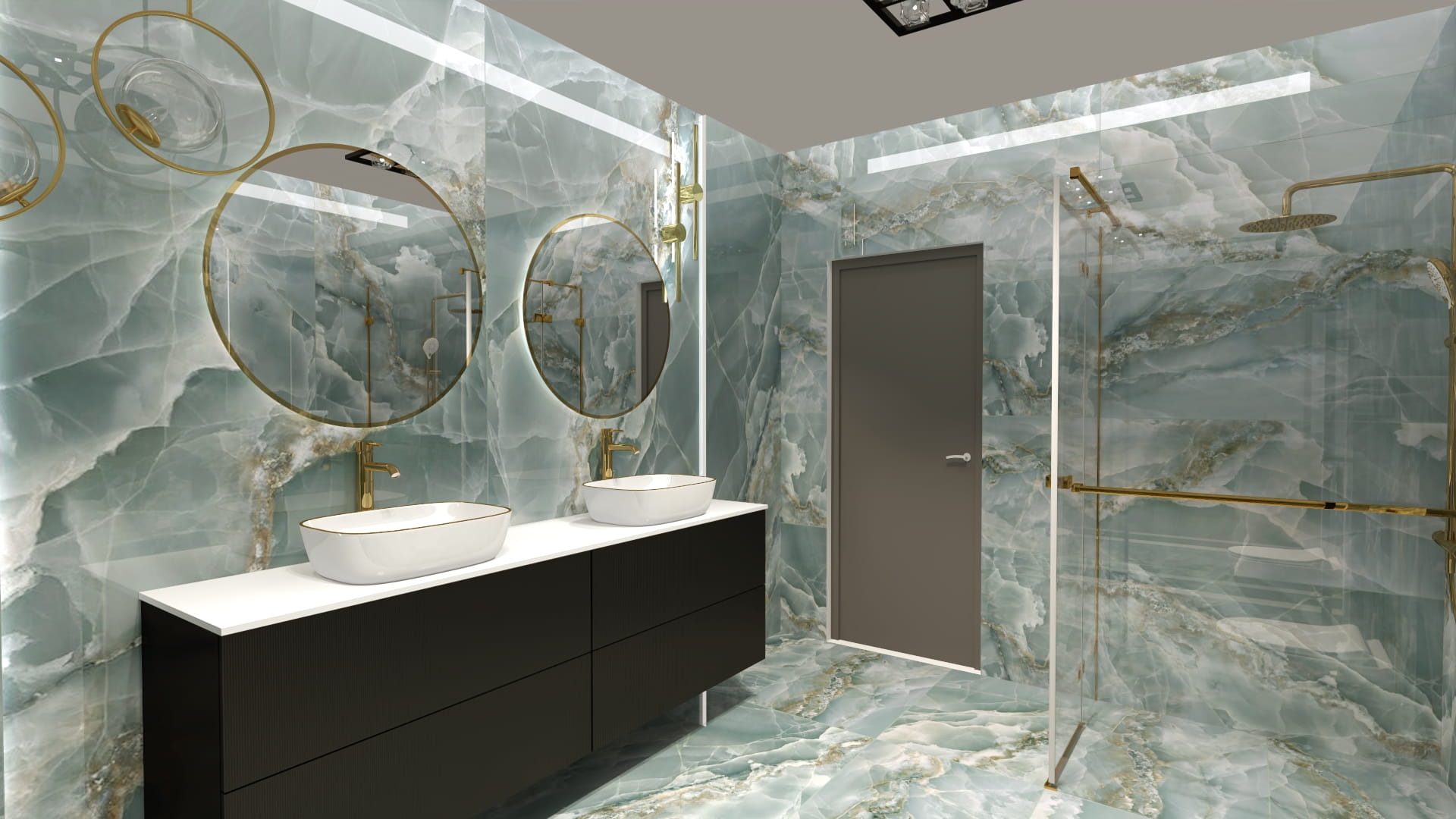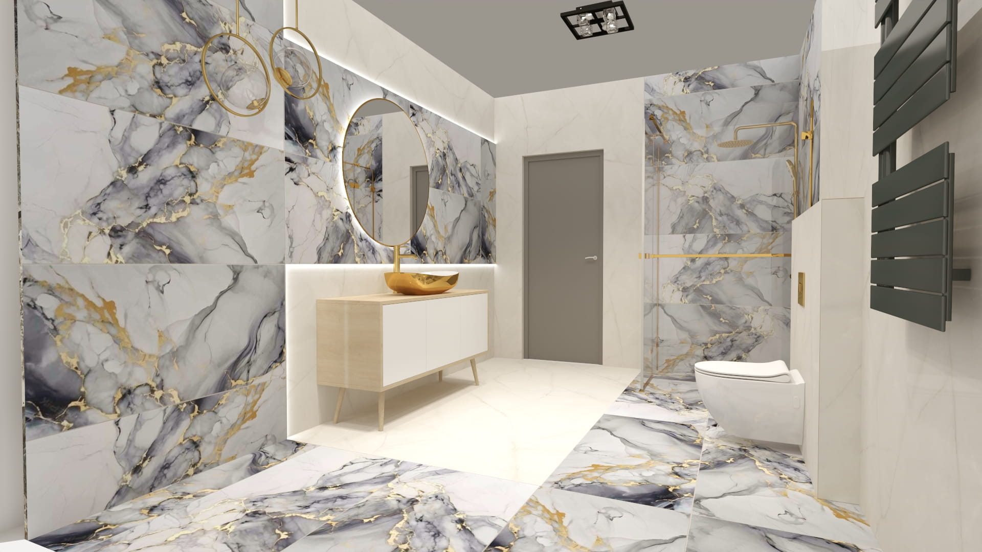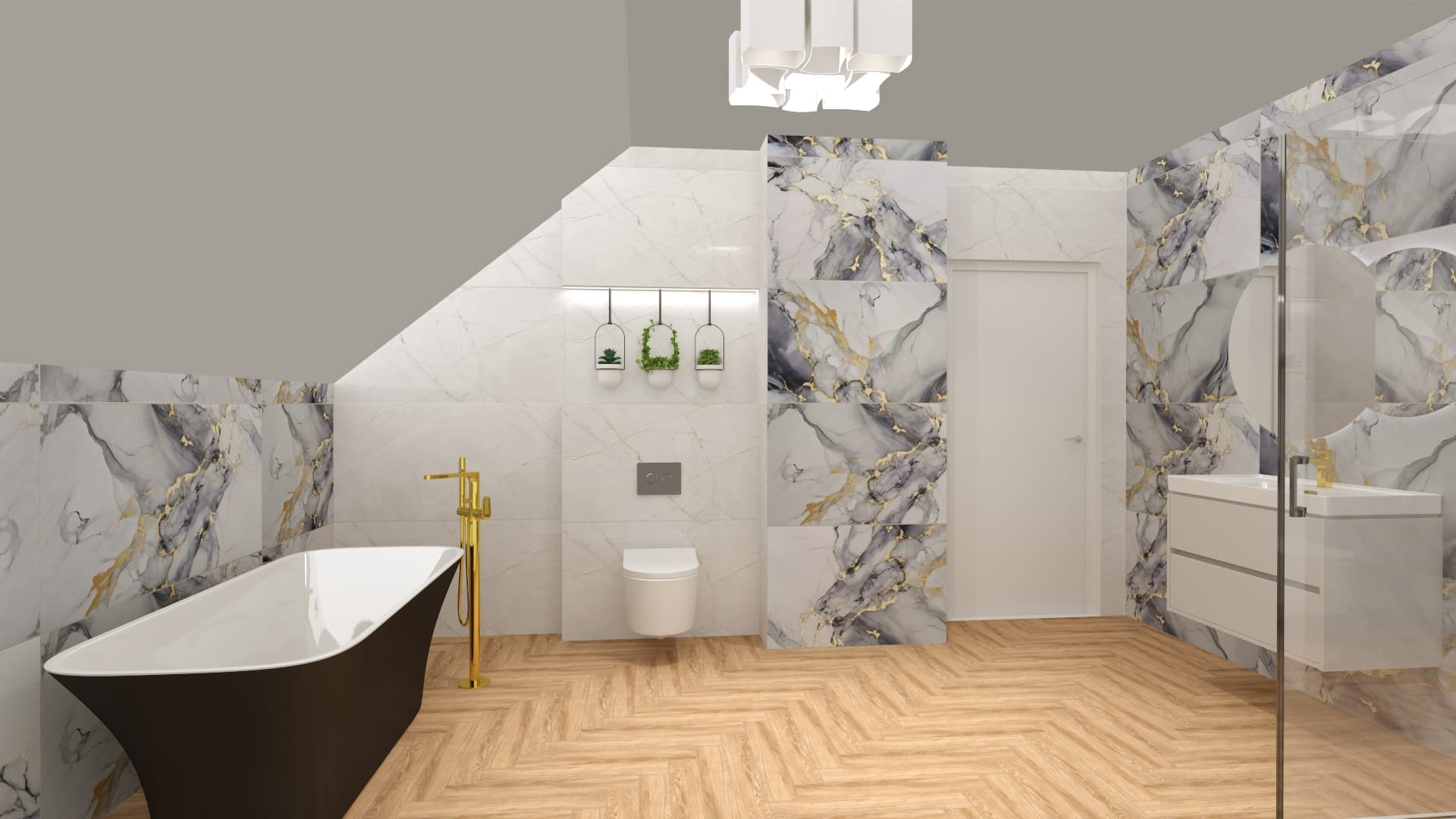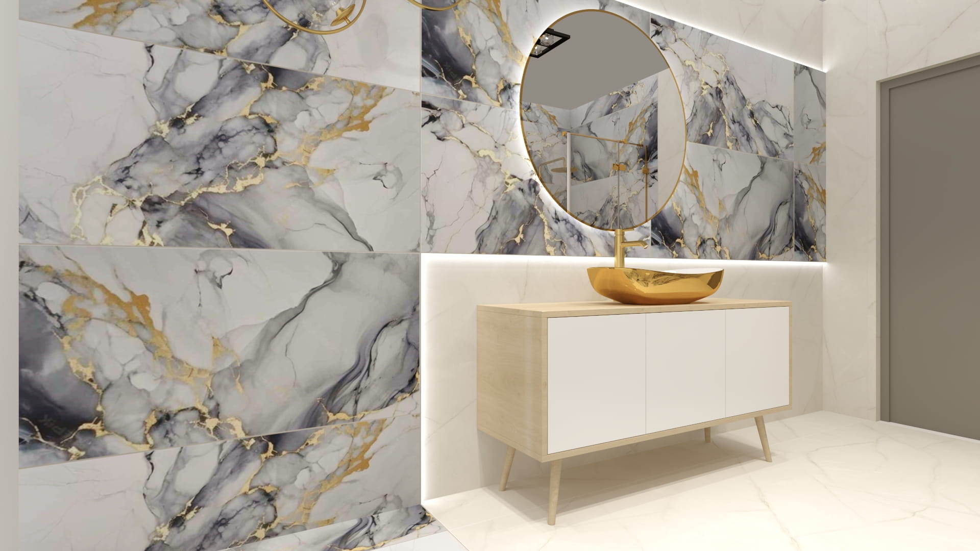 - Beż + złote detale + duże polerowane płyty