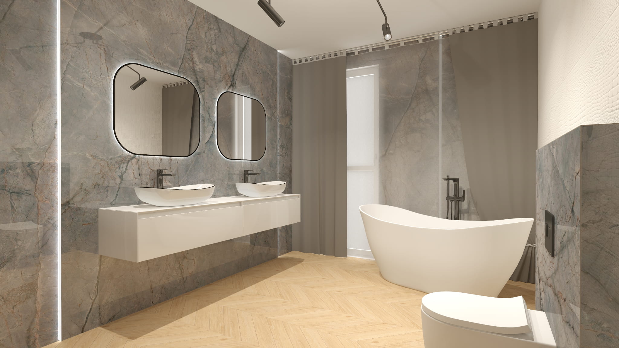- Szaro-drewniana elegancja + czarne matowe armatura