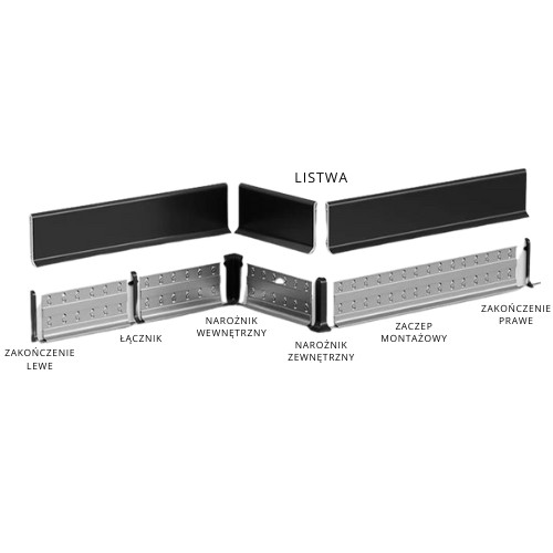 Przy użyciu akcesoriów, takich jak narożnik zewnętrzny, narożnik wewnętrzny, zakończenia: lewe i prawe, łączniki – uzupełnij i połącz ze sobą listwy, aby uzyskać estetyczne wykończenie.