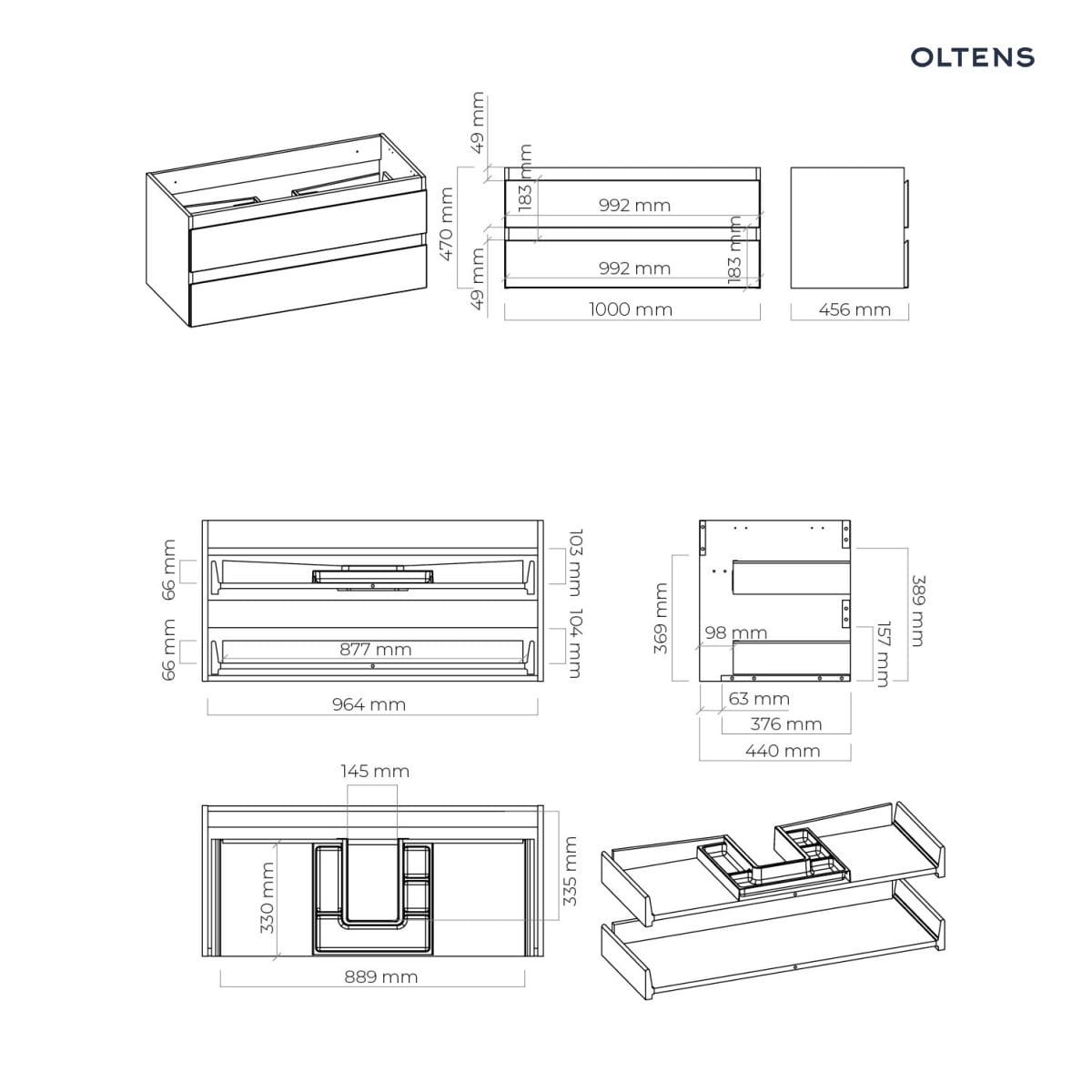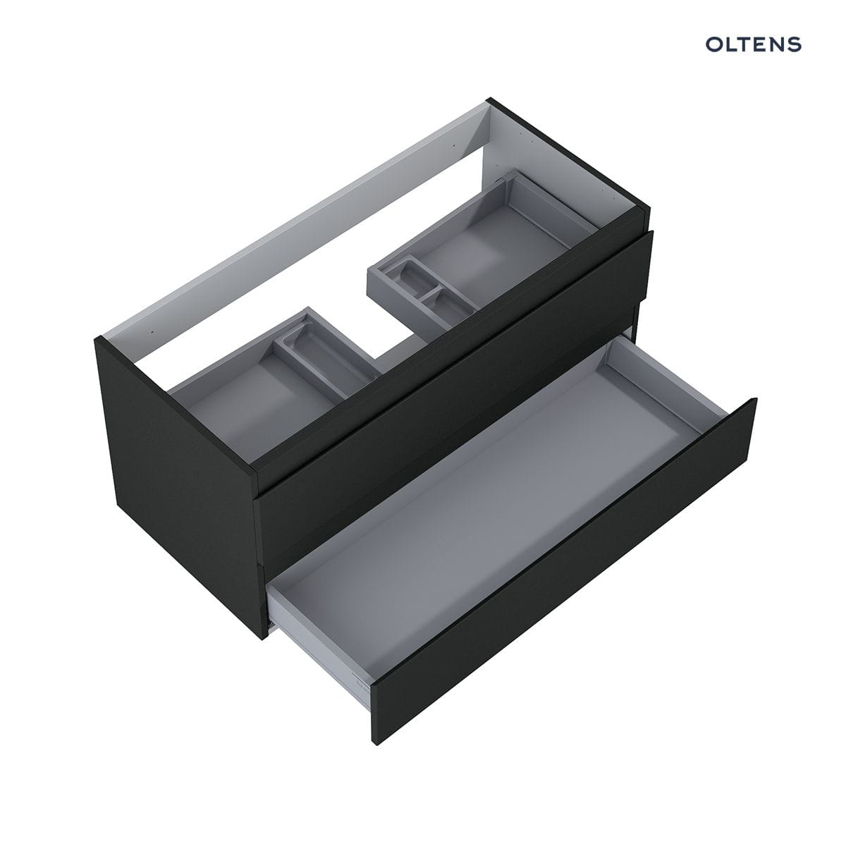 Opis produktu Oltens Vernal umywalka z szafką 100 cm czarny mat 68038300 Oltens Vernal szafka 100×45,6×47 cm podumywalkowa wisząca czarna 60002300 – wisząca szafka z 2 szufladami – szerokość 100 cm – głębokość 45,6 cm – wysokość 47 cm – szuflady metalowe – organizer w górnej szufladzie – w szafce zamontowane są szuflady z systemem Oltens QuietClose czyli systemem cichego domyku (pozwalają one na ciche i delikatne zamykanie szuflad) – zastosowane w szafce prowadnice szuflad pozwalają na pełne ich wysunięcie, dzięki czemu korzystanie z szuflad jest wygodniejsze – waga netto 28 kg – waga brutto 30 kg – szafka z płyty MDF, powłoka lakierowana odporna na promieniowanie UV – kolor czarny mat