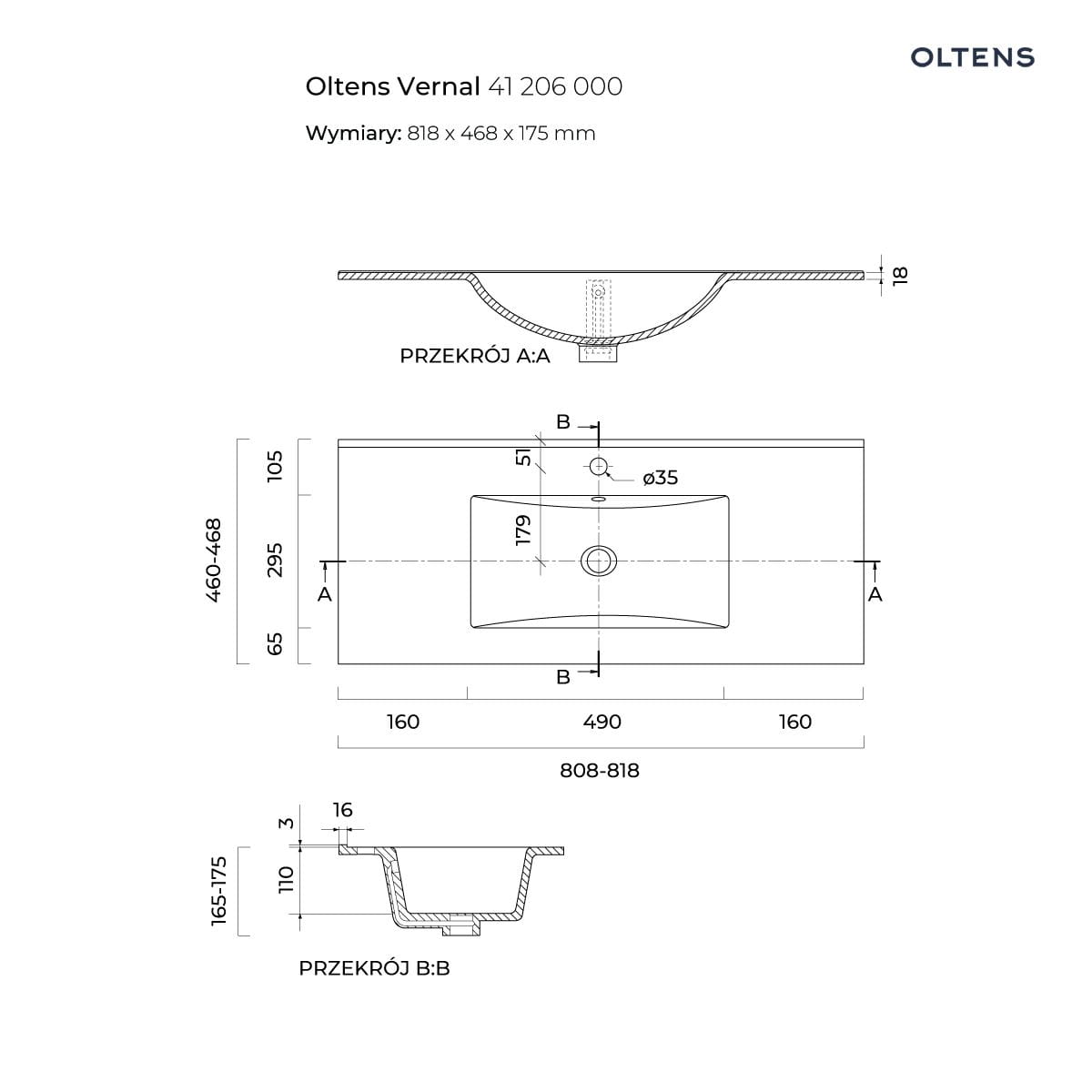 – szerokość 81 cm – głębokość 46 cm – wysokość 17 cm – kształt prostokątny – otwór na baterię Ø35 mm – z przelewem – waga netto 15 kg – waga brutto 16,5 kg – kolor: czarny mat